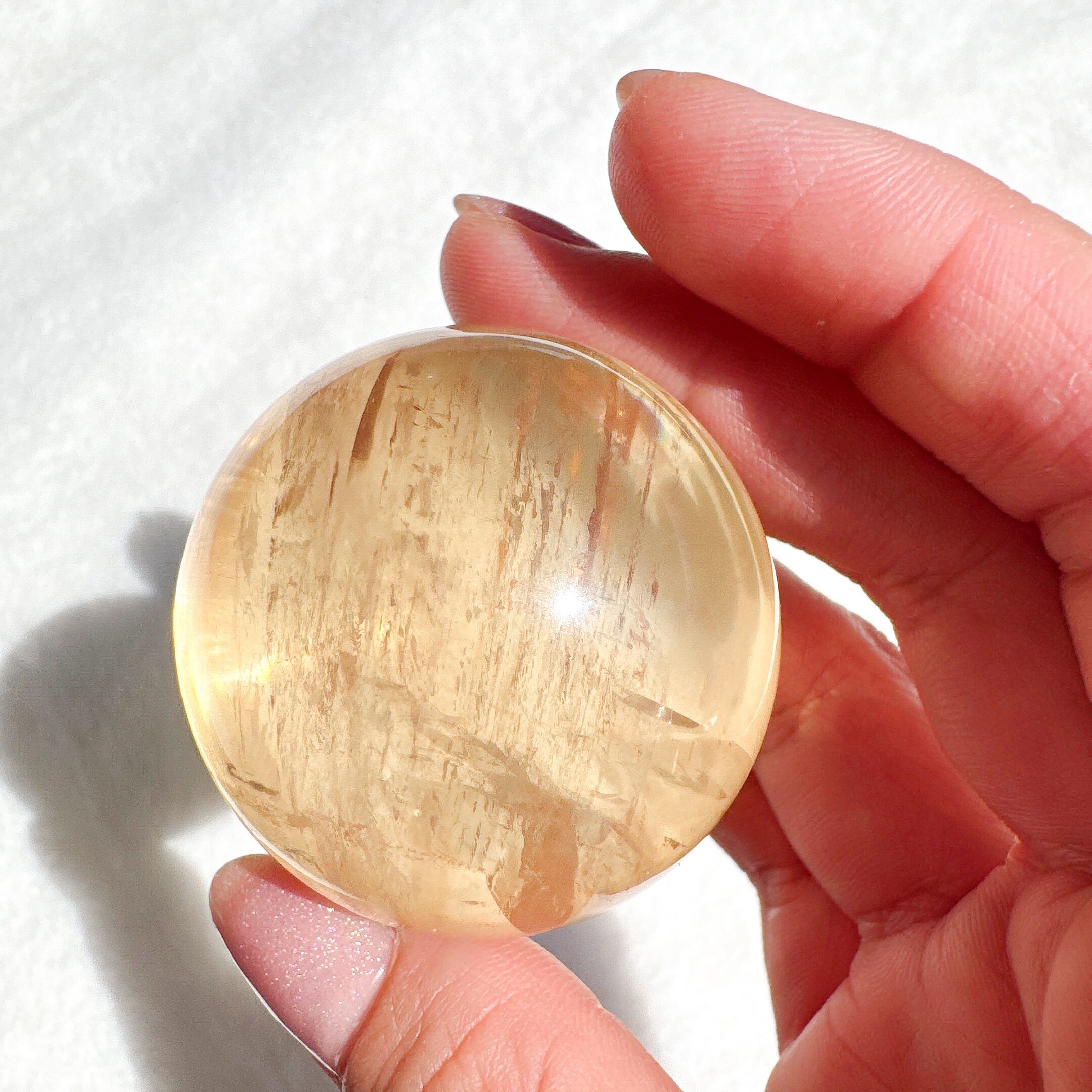 まさにハニーという名に相応しいハニーカラーのカルサイトスフィア♡ぎらんきらんの虹ではなく優しい虹が出るスフィアです♡クリアクォーツとはまた違った虹の出かたにキュンとします♡ライトの上に置くと満月のようにも見えます♡透明度の高めの子です♡