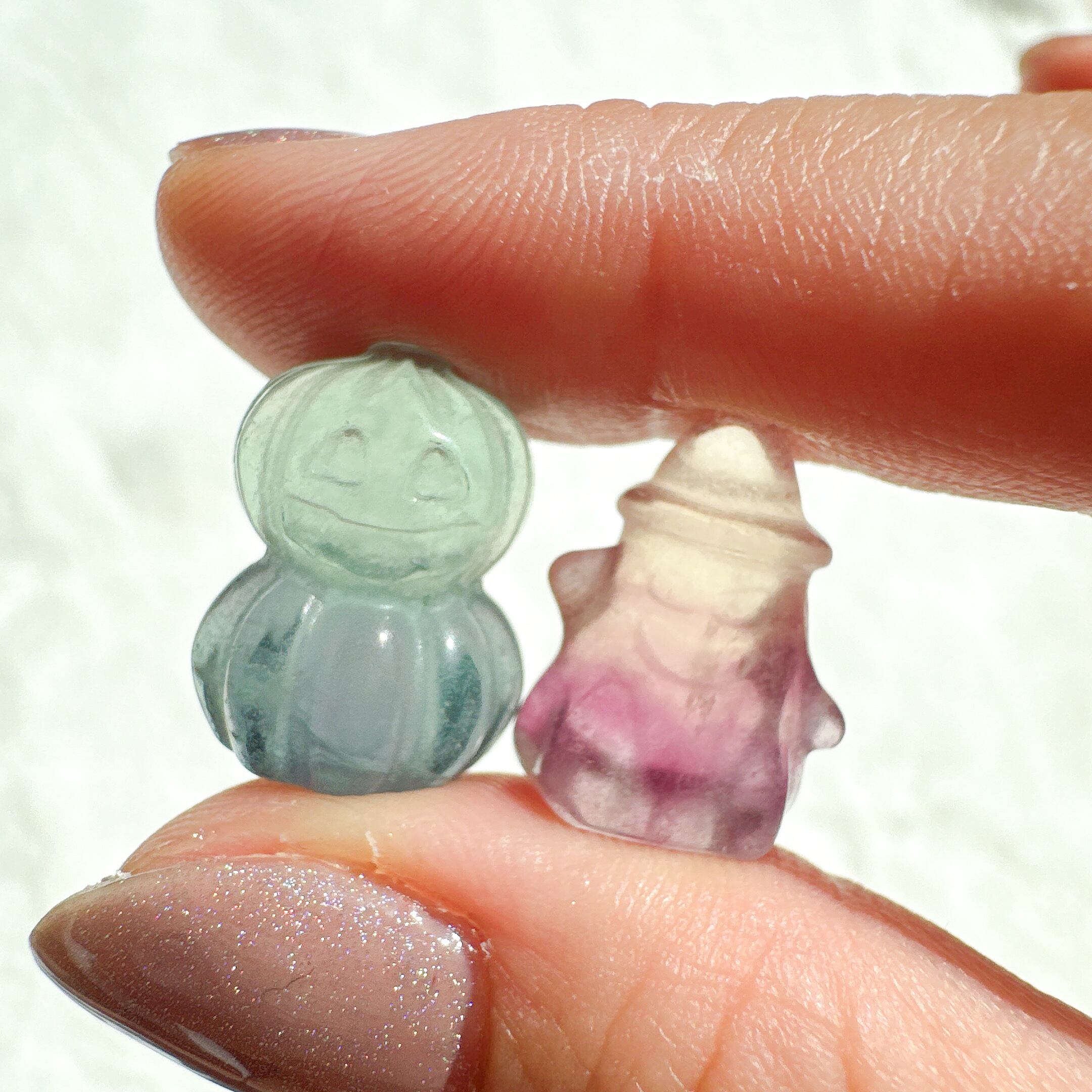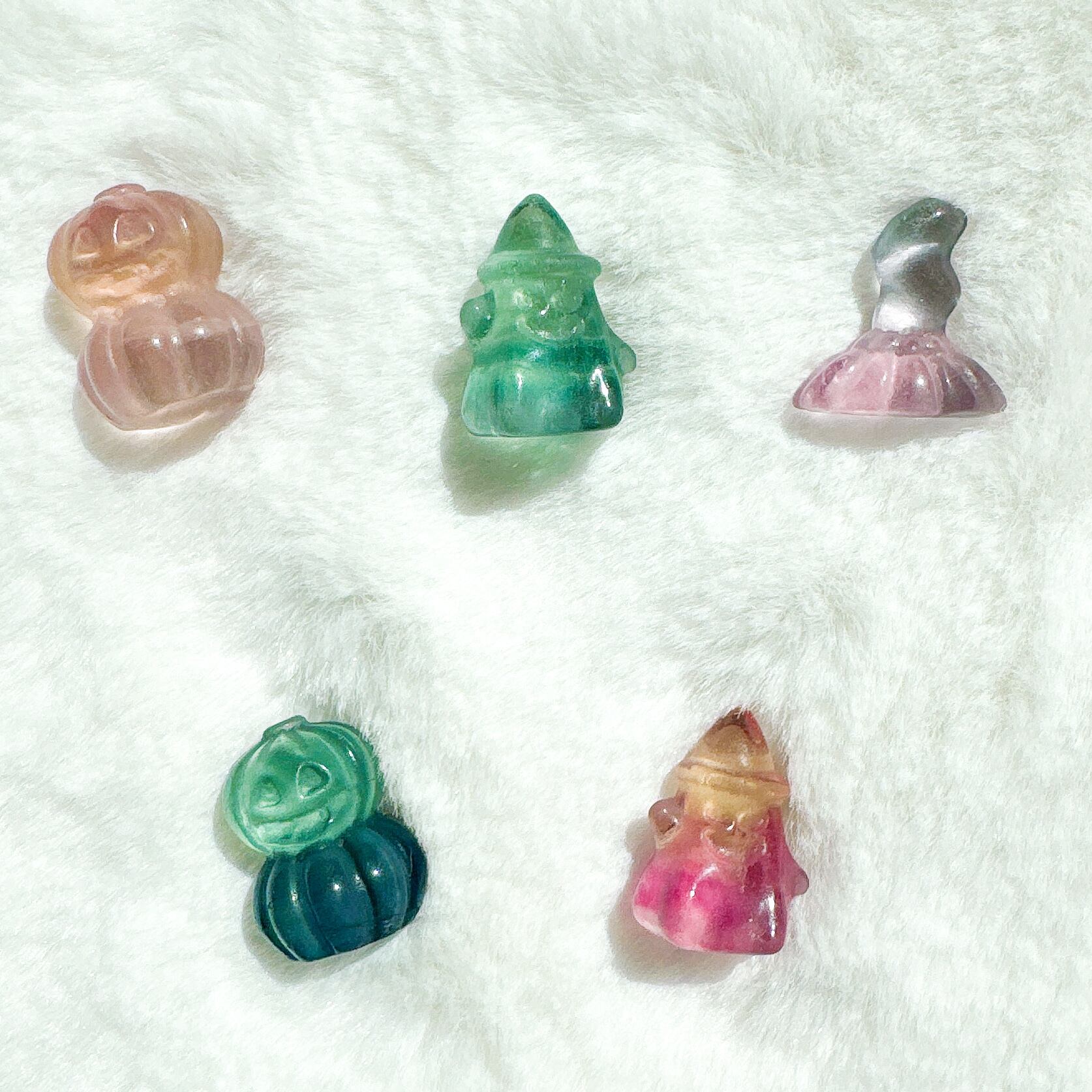 2cm弱の可愛いフローライトのハロウィンカービングを集めてセットにしました♡どの子もキャンディカラーの可愛い子たちです♡Bはジャックオランタン・魔女おばけの2個セットです♡