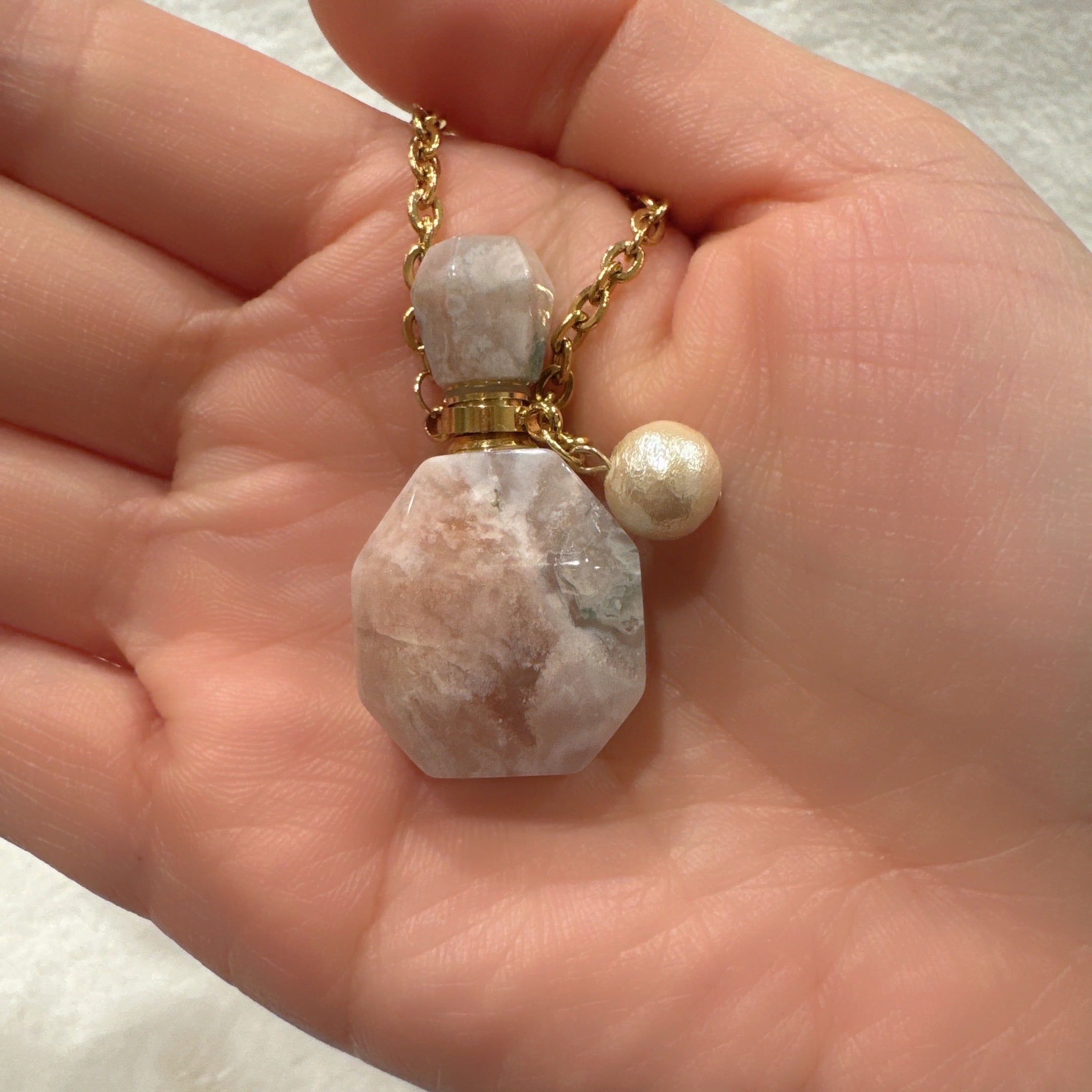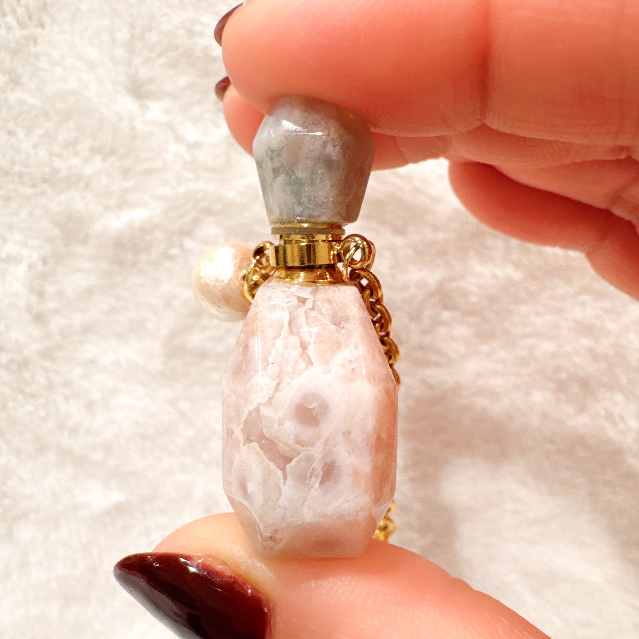 落ち着いた大人ピンクのボディにパープルやグリーンも混ざっていてマーブル模様のような香水瓶ちゃん♡Lithicaオリジナル仕様でチェーンや留め具はサージカルステンレスで錆びにくく変色しにくい仕様となっています♡さらにコットンパールをつけて可愛さ増し増しに♡ご自身でネックレスなどに変更されても可愛いと思います♡