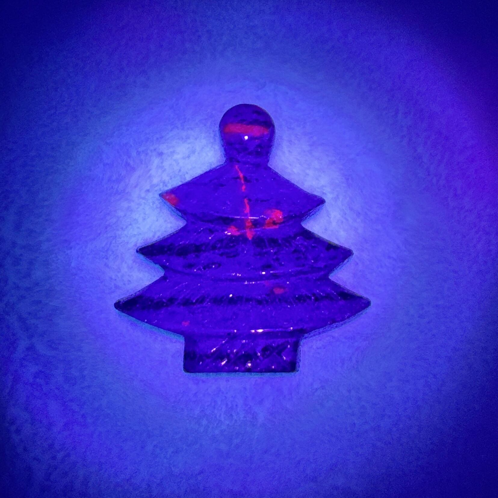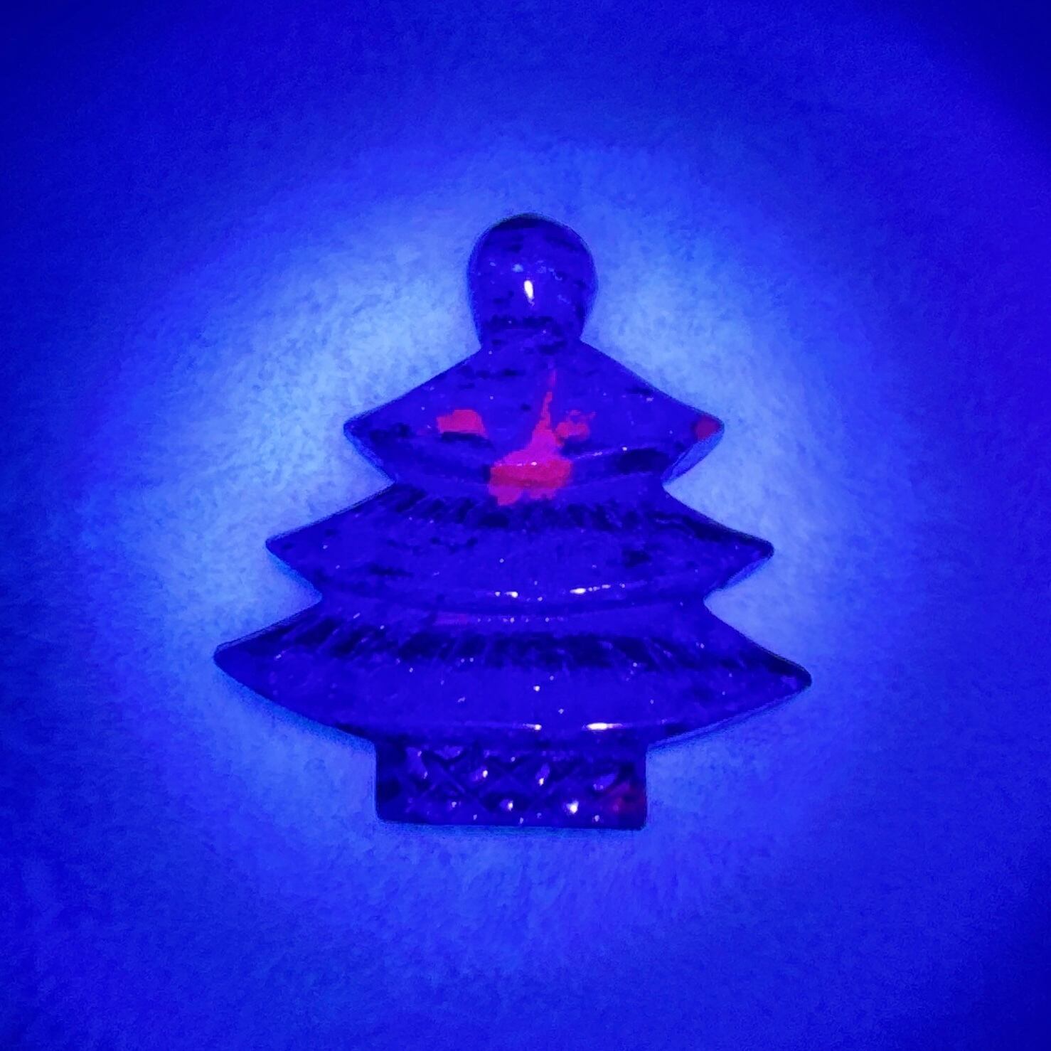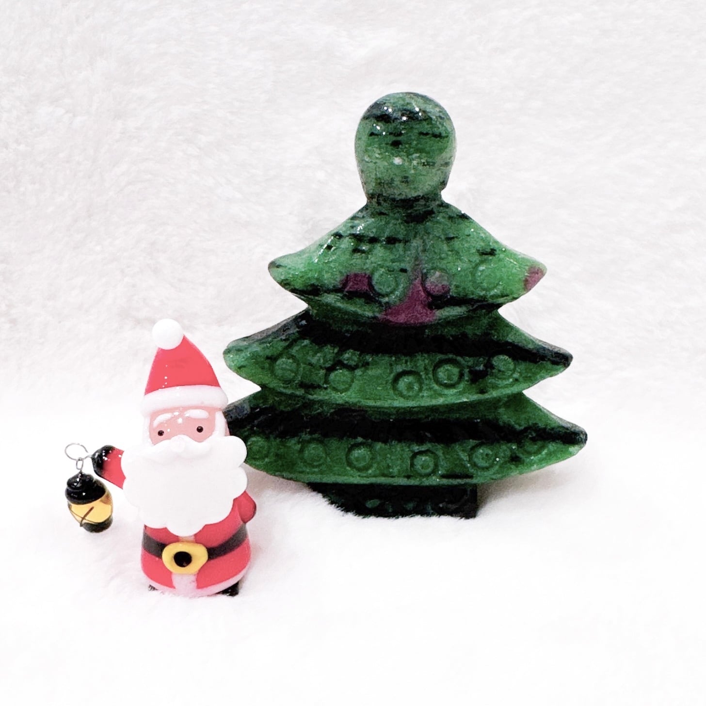 ゾイサイトの中にルビーが混入しているものをルビーインゾイサイトと呼びます♡形もツリーですが、ゾイサイトのグリーンにブラックの模様とルビーがぽんぽんと入っていて自然が創り出した天然クリスマスツリーになってます♡ブラックライトを当てるとルビーが蛍光ピンクに発光します♡天然石は毎年飾れるのがいいですよね♡