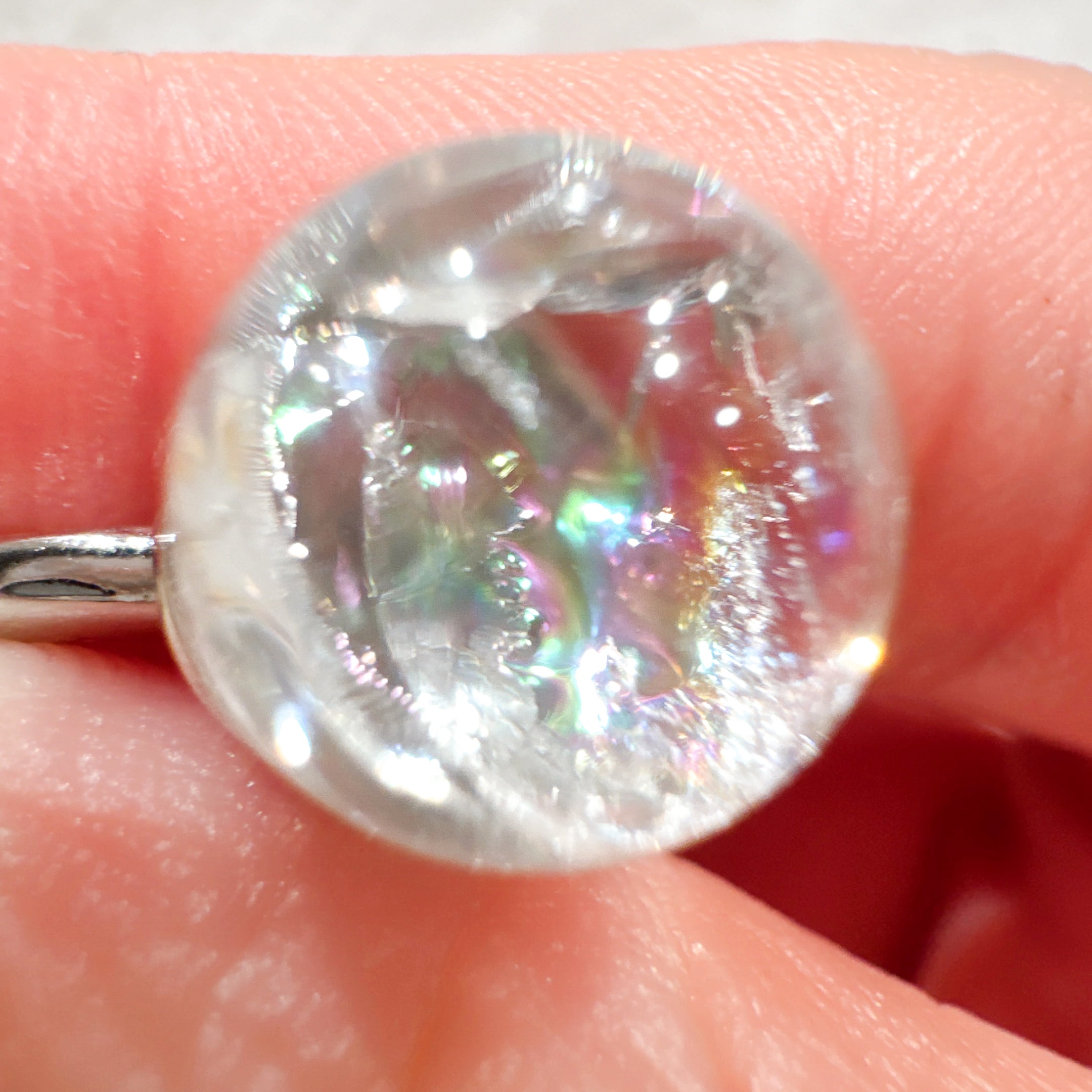 鮮やかな虹を放つ約1cmのアイリスクォーツスフィアがシルバーリングに♡リングなので手元を見ればいつでも虹が確認できてついつい見惚れてしまいます♡1cmでも指につけると存在感があります♡クリアなのでどんな服装にも合いますしお手元のアクセントにもなります♡お友達とお揃いでつけても素敵♡サイズ調整可能なシルバーリングです♡