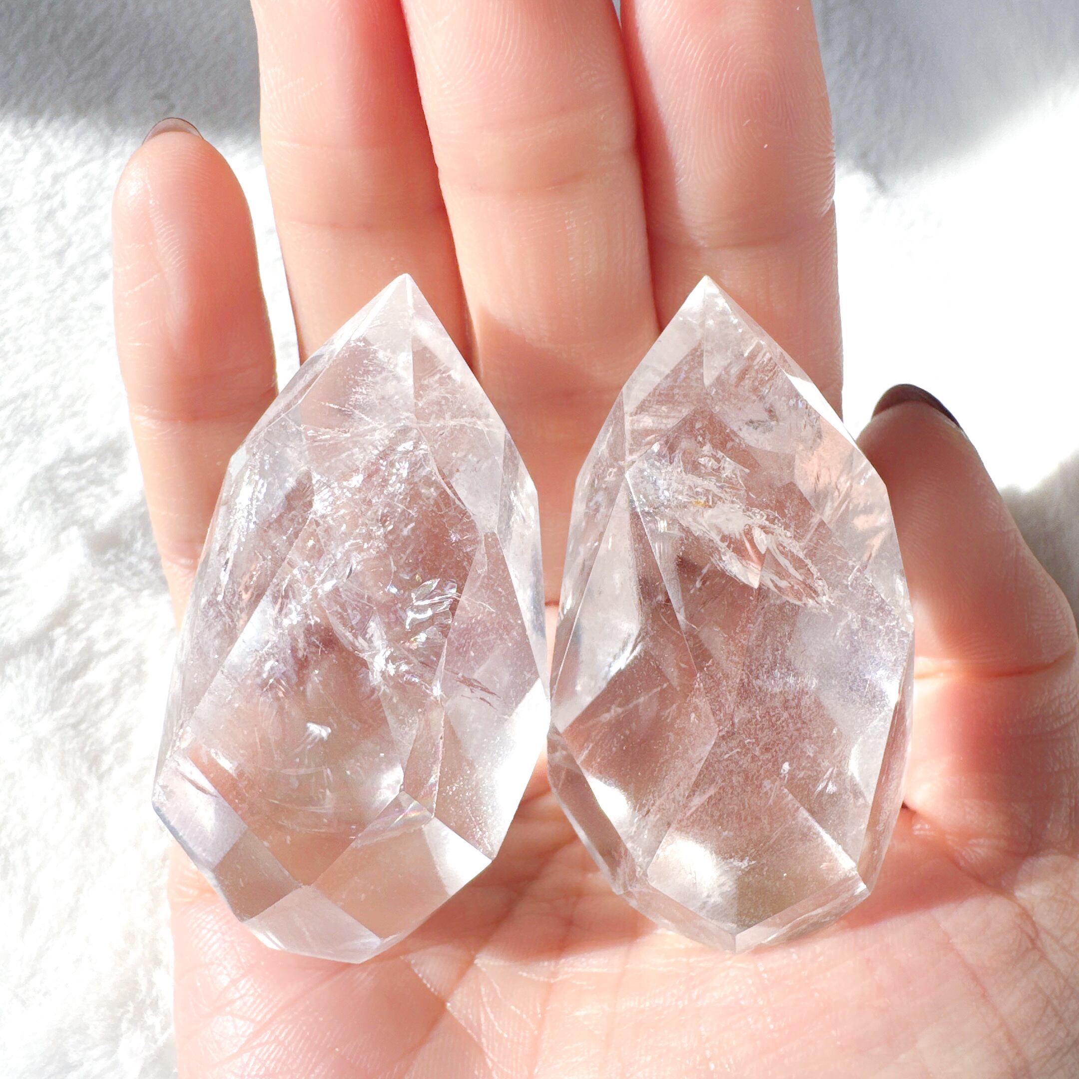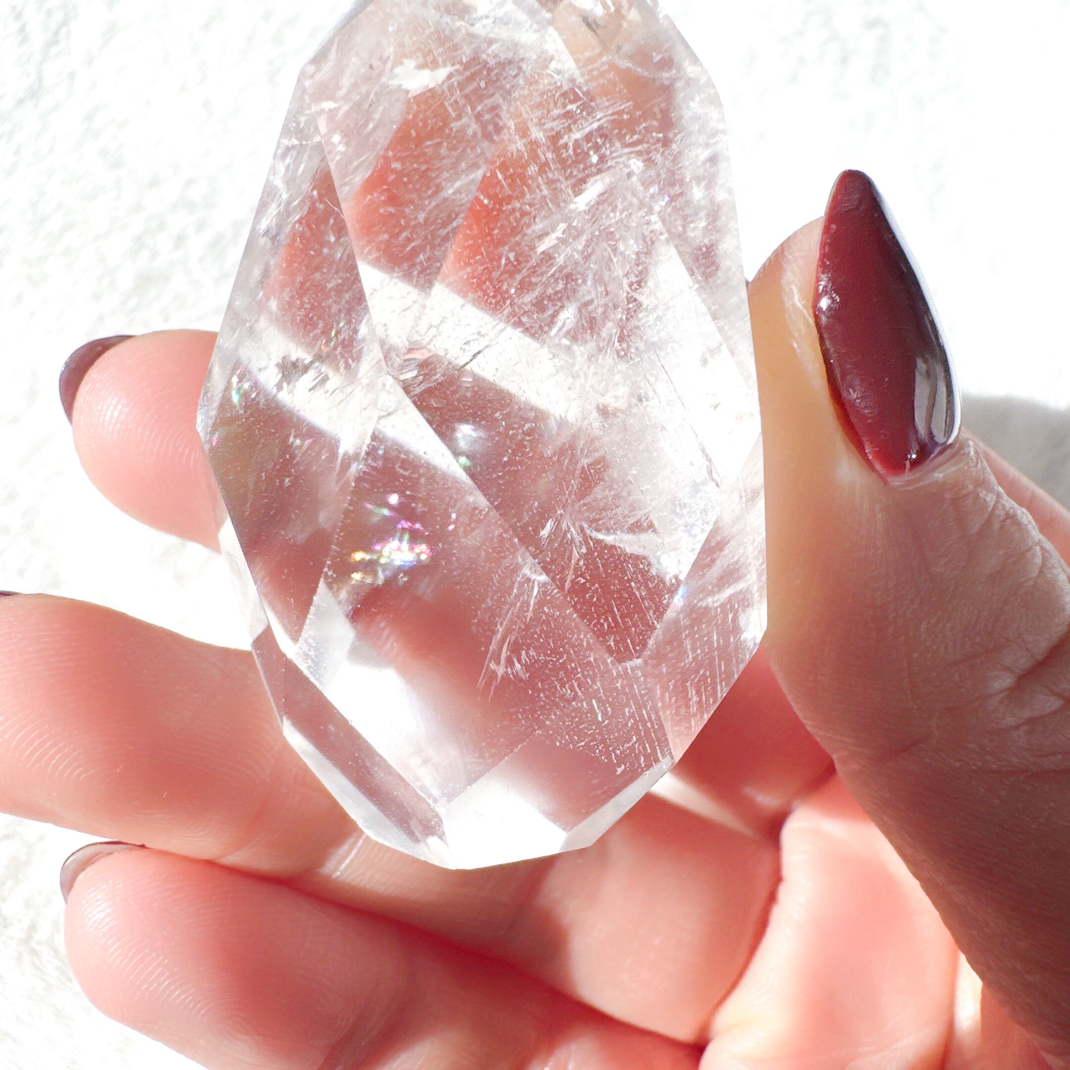 しずくの形で多面体カットを施したクリアクォーツ♡ファセットカットされているので宝石みたいに美しい見た目をしているだけでなく虹もキラキラ♡光を当てるとサンキャッチャーのように眩ゆい光をキャッチしてくれます♡インテリアにもぴったりな子です♡Bちゃんは下の方メインに虹がいる子です♡