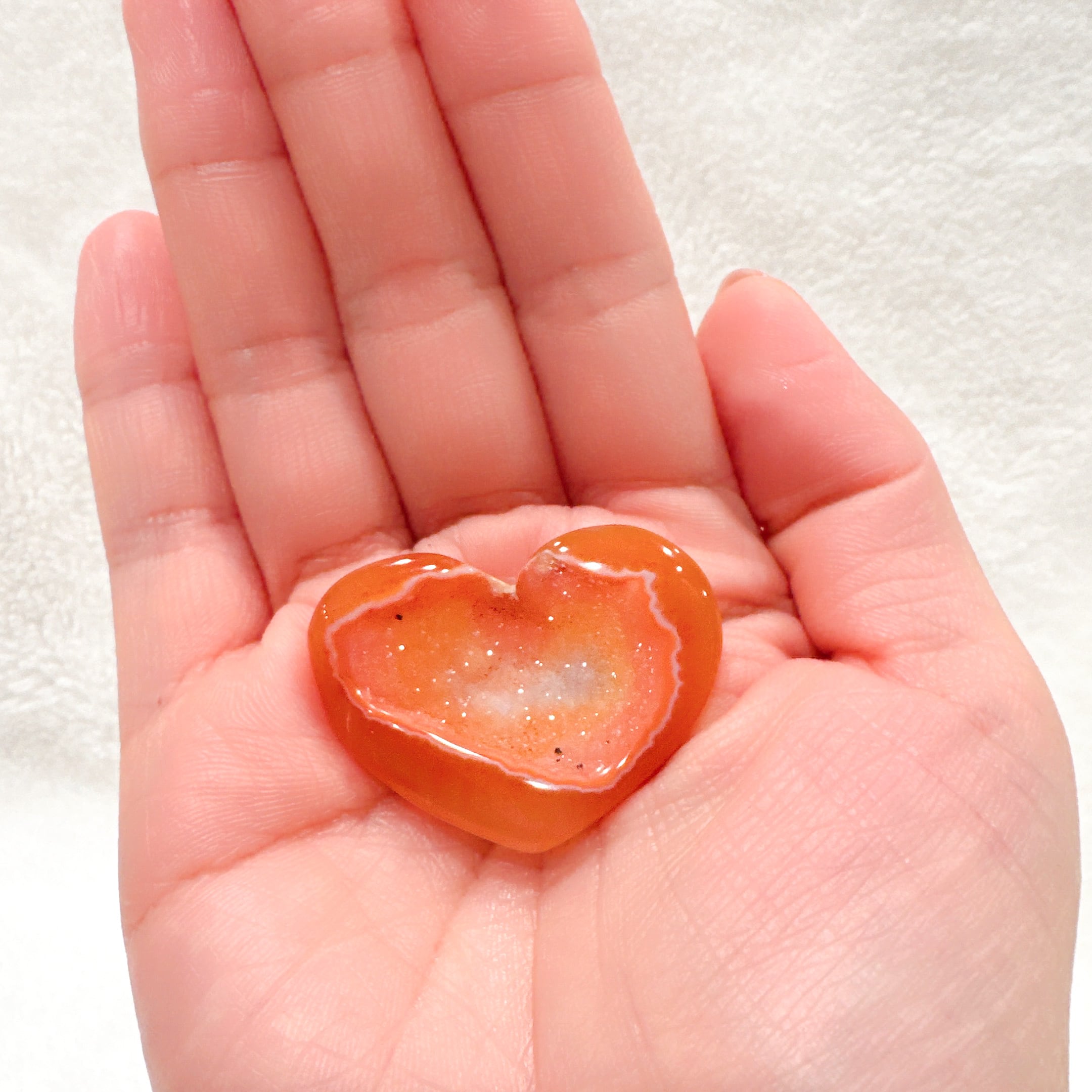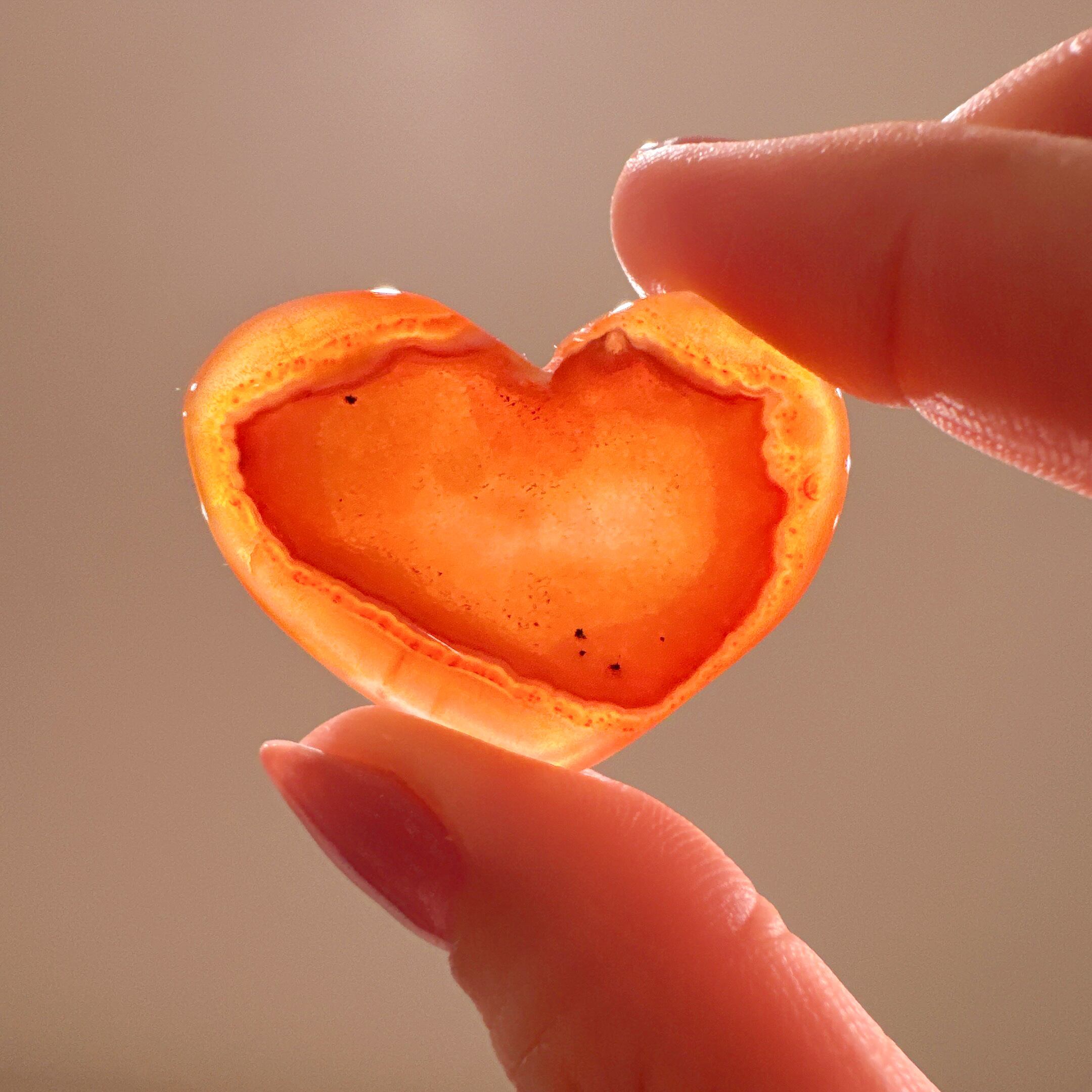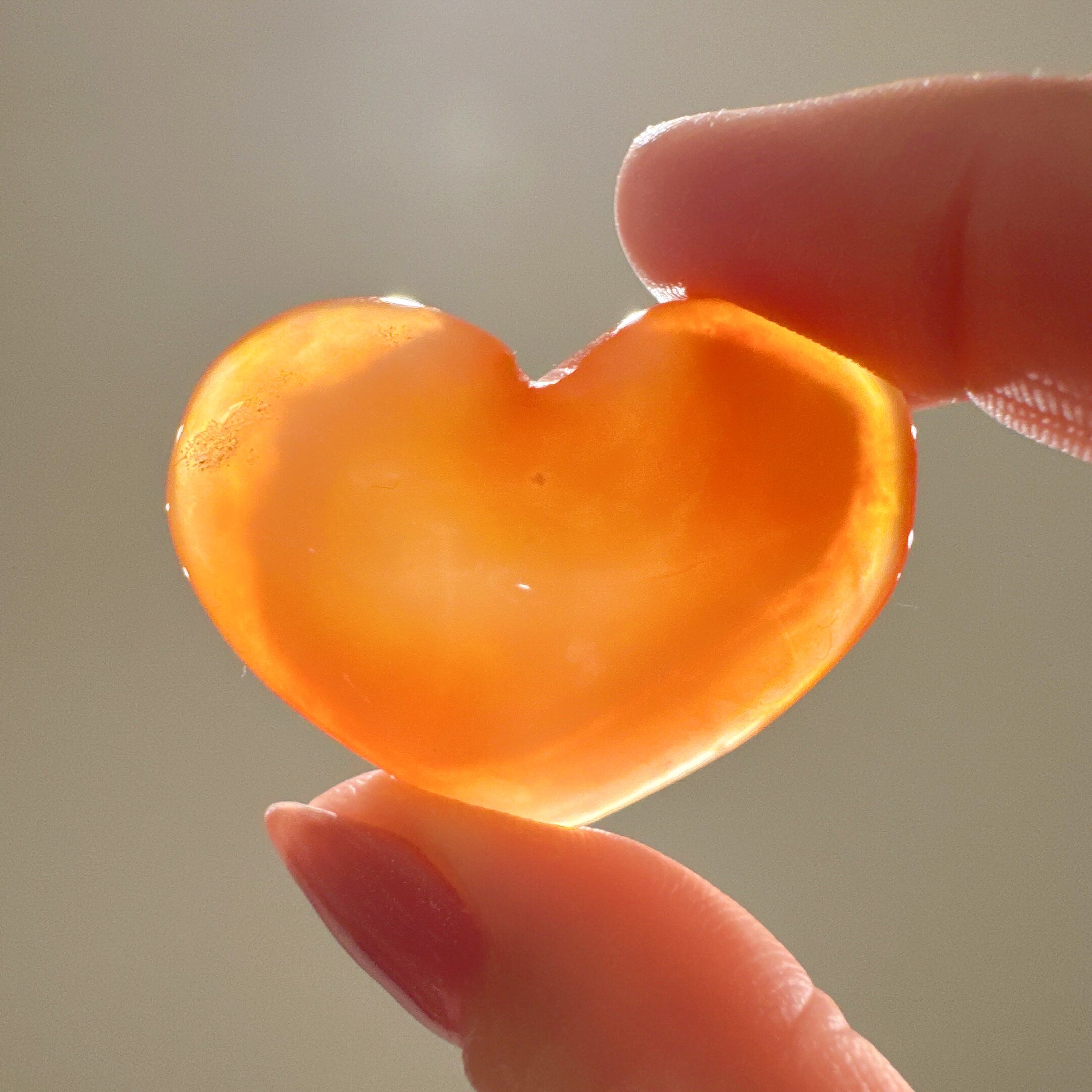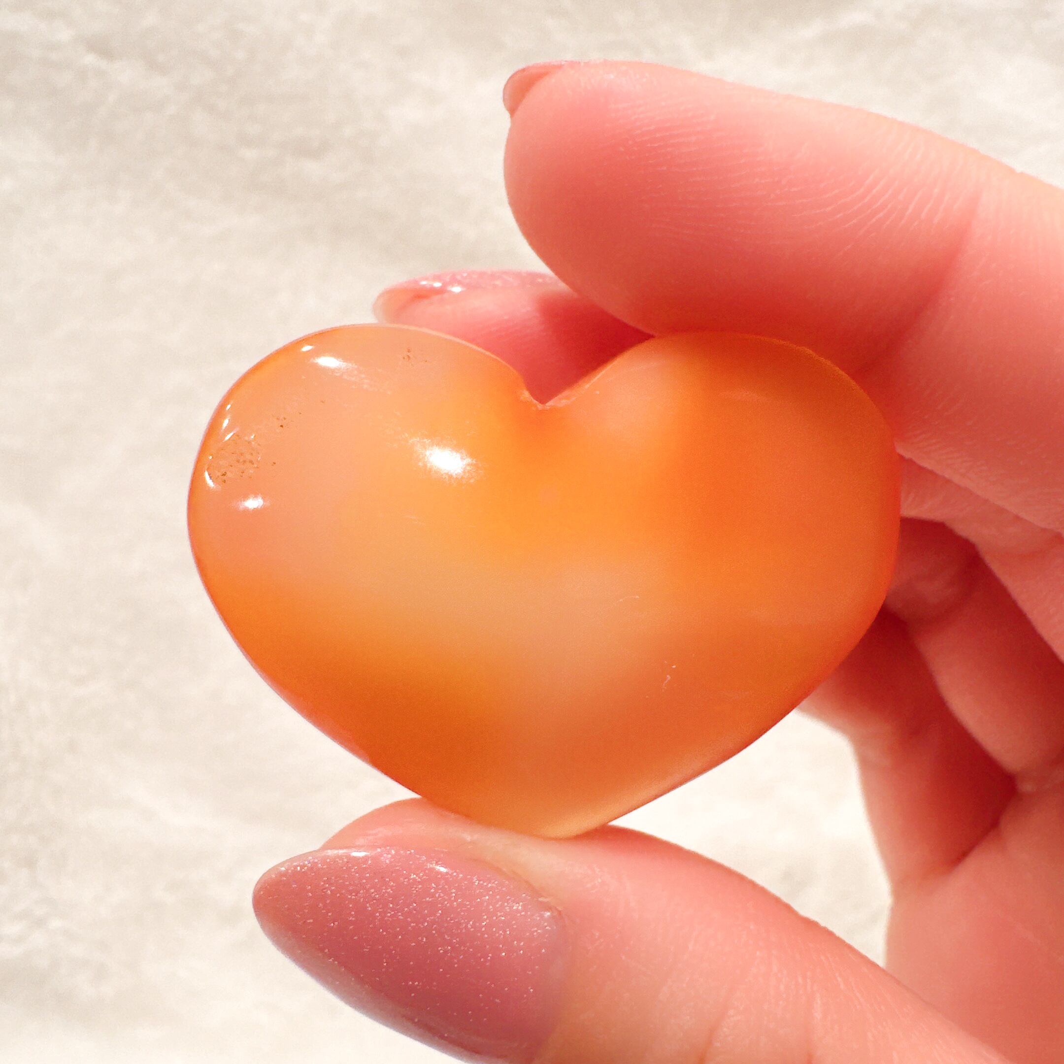 ハートシェイプのドゥルージーカーネリアン♡ハートちゃんが笑っているように見える笑口でFちゃんは淡いオレンジカラーでドゥルージー部分もハートの形のキラキラオレンジが可愛い子です♡ライトアップするとまた違った表情を見せてくれます♡お気に入りのリング置きや浄化にも♡