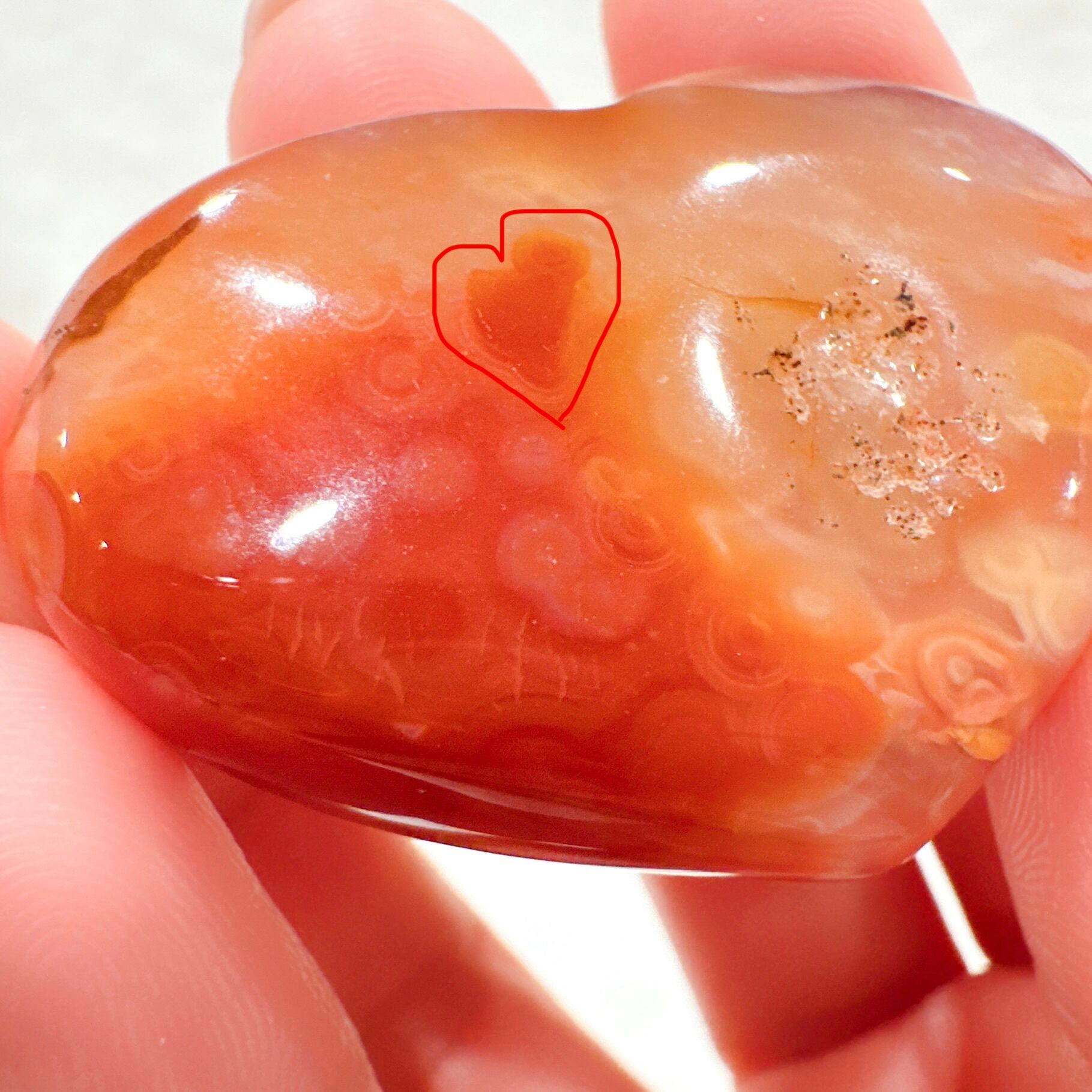 ハートシェイプのドゥルージーカーネリアン♡ハートちゃんが笑っているように見える笑口でJちゃんはシュガードゥルージーがキラキラでハート上部の縞模様や裏側の模様がユニークな子で隠れハートも♡ライトアップするとまた違った表情を見せてくれます♡お気に入りのリング置きや浄化にも♡