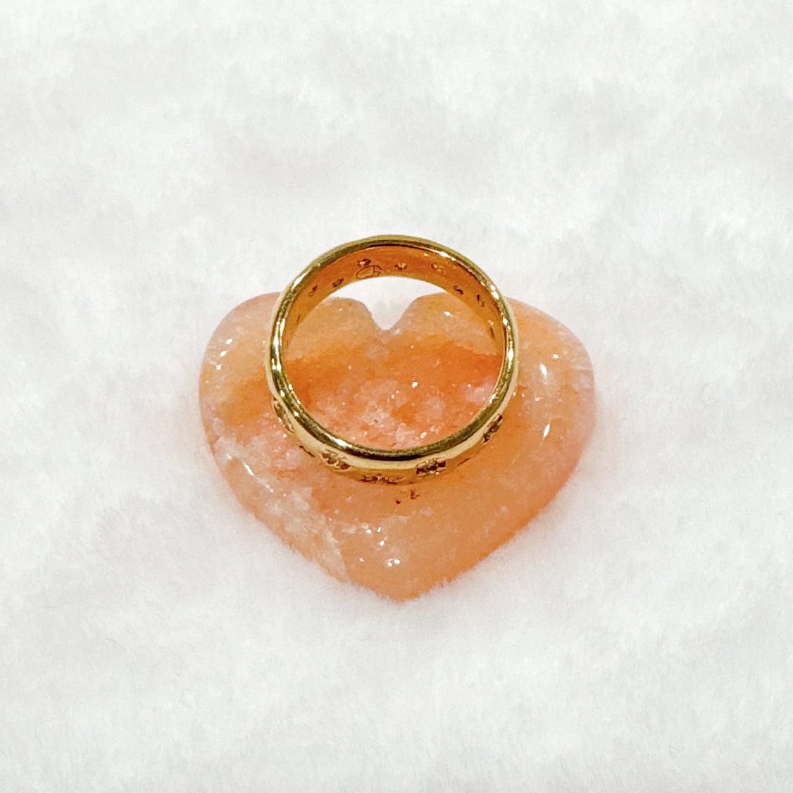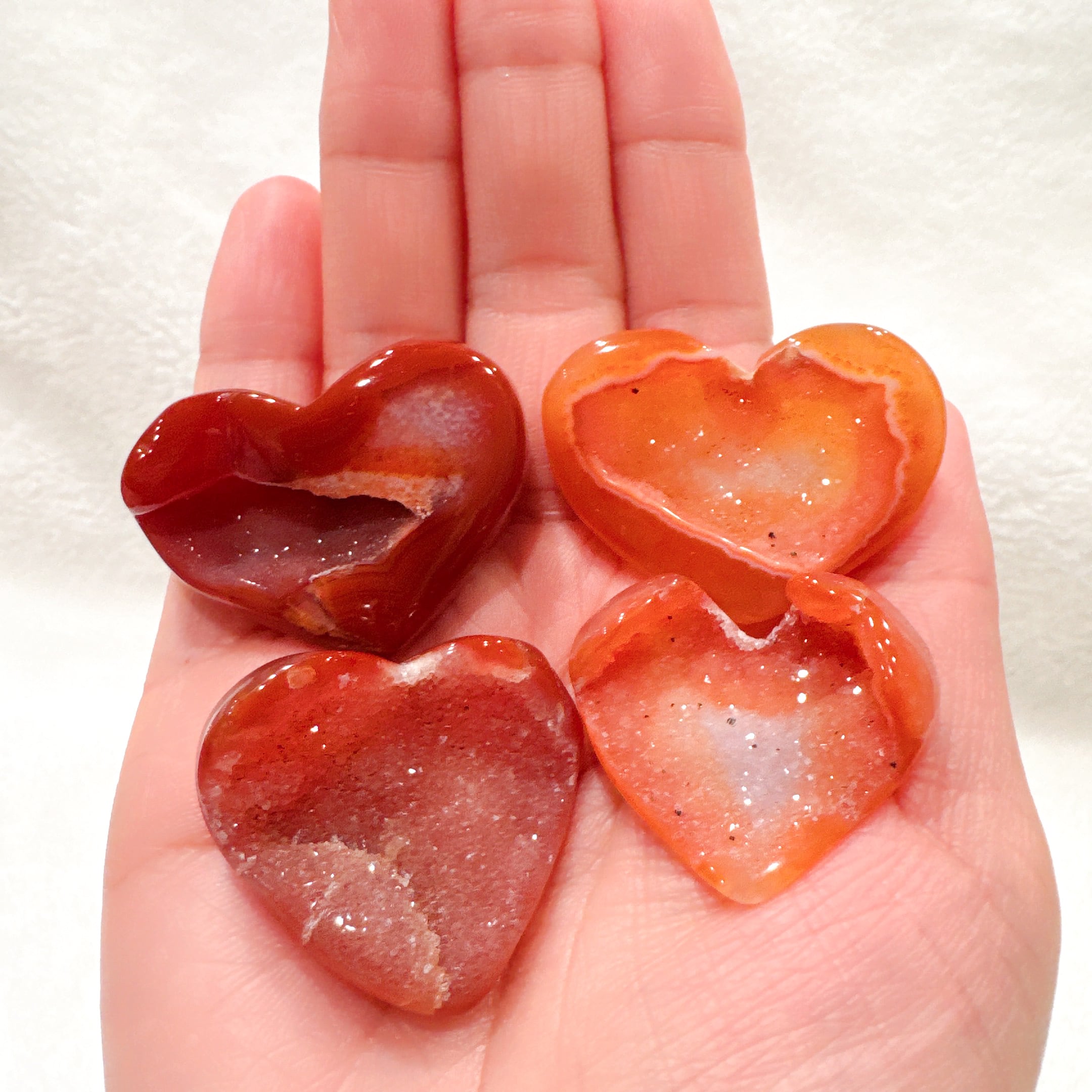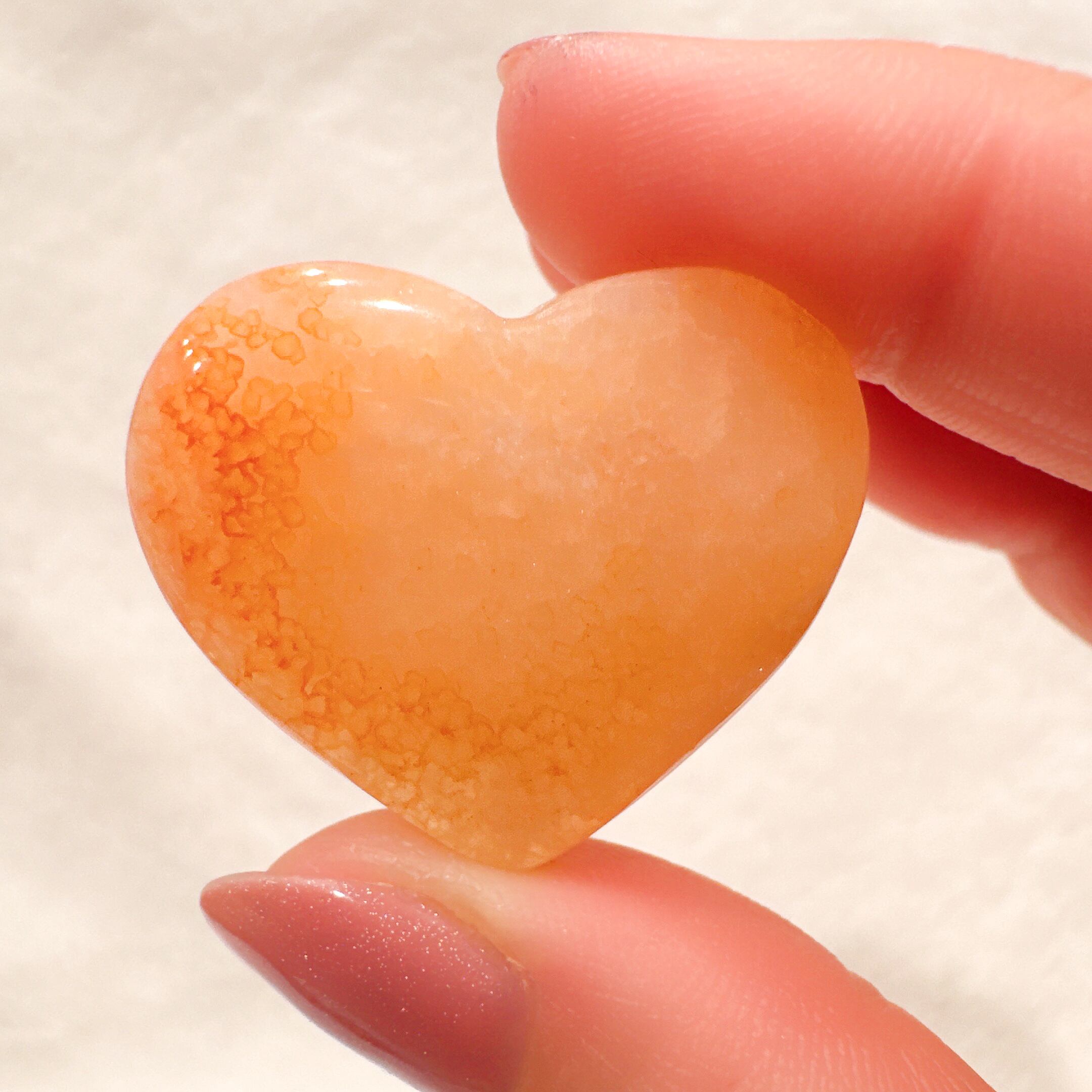 ハートシェイプのドゥルージーカーネリアン♡ハートちゃんが笑っているように見える笑口でKちゃんはホワイトよりのオレンジカラーで結晶がキラキラ美しい子です♡虹がちらりと見えるところも♡ライトアップするとまた違った表情を見せてくれます♡お気に入りのリング置きや浄化にも♡