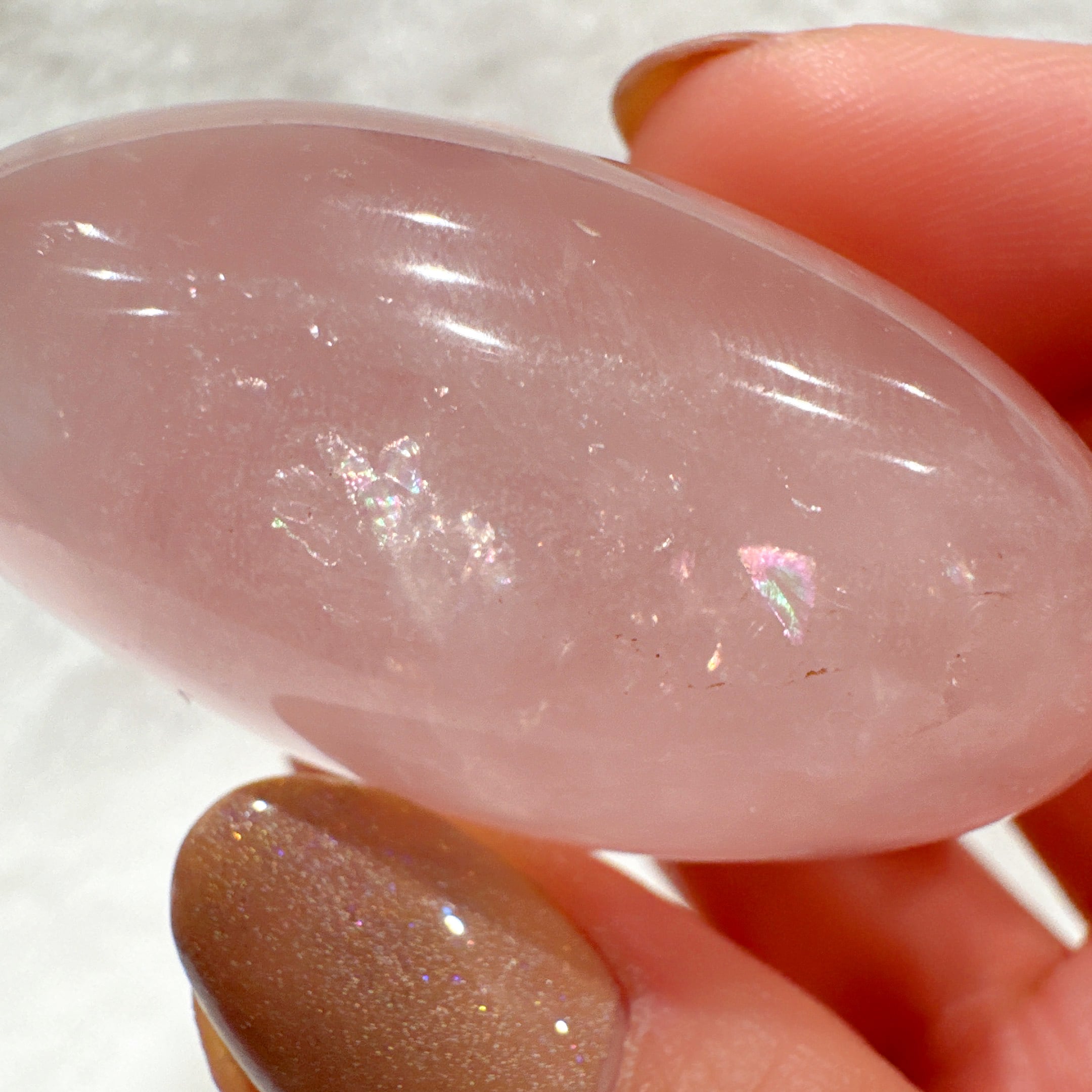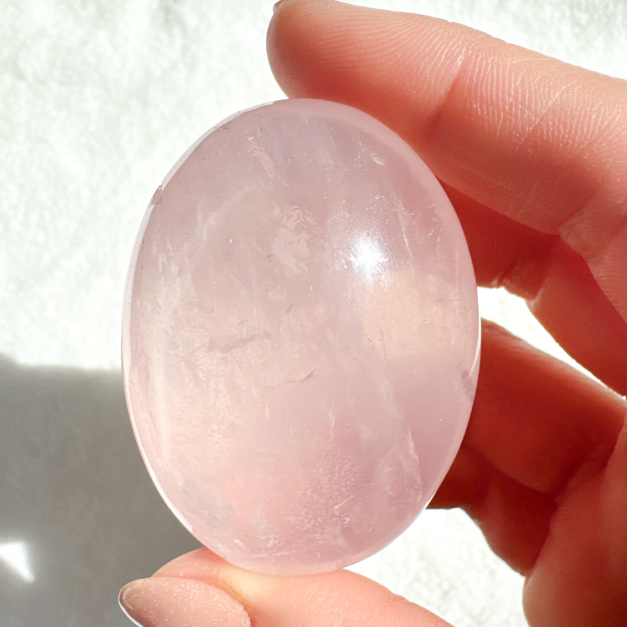 うるちゅるなローズクォーツパームでシラーや虹もあります♡春を思わせるローズクォーツらしいピンクカラーがとってもcuteです♡強い光を当てると6条スターが現れます♡3つの中で1番ぷっくりした子です♡手に馴染むサイズ感も♡