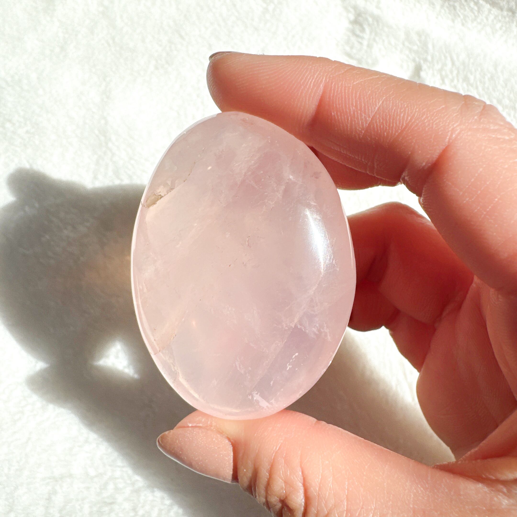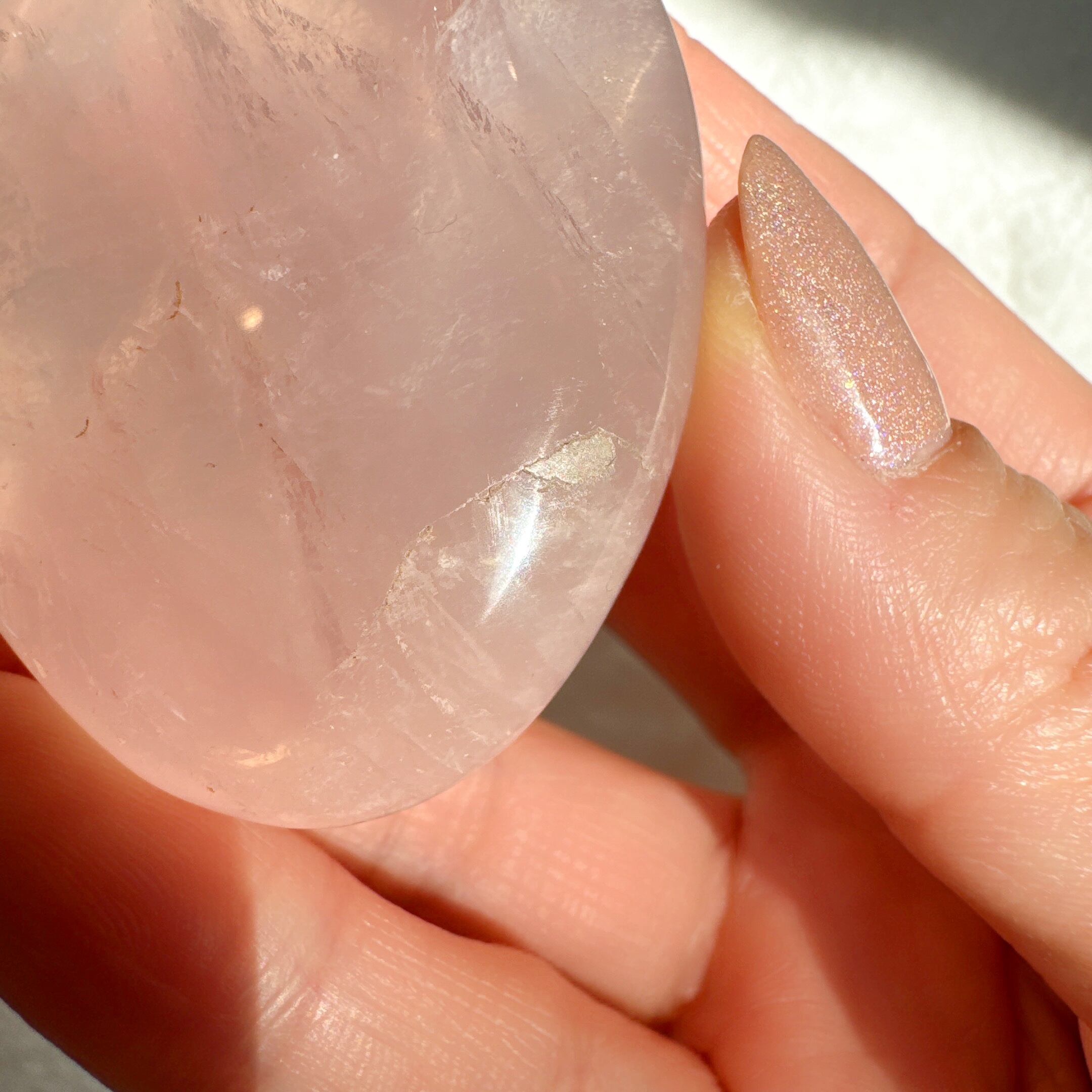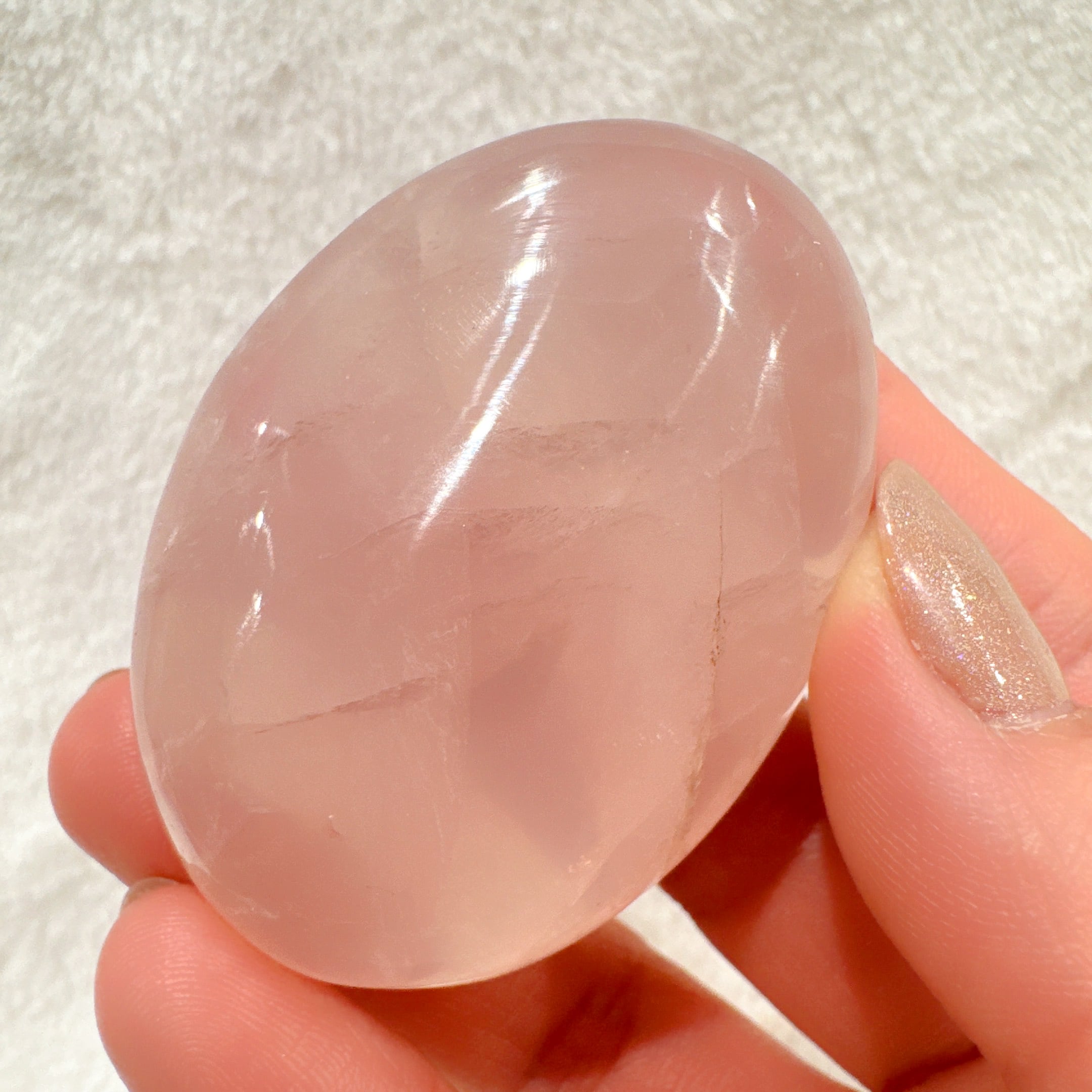 うるちゅるなローズクォーツパームでシラーや虹もあります♡春を思わせるローズクォーツらしいピンクカラーがとってもcuteです♡強い光を当てると6条スターが現れます♡AちゃんBちゃんと比べると虹は少なめですが6条スターが1番はっきり見える子です♡3つの中で1番濃いめのピンクです♡手に馴染むサイズ感も♡