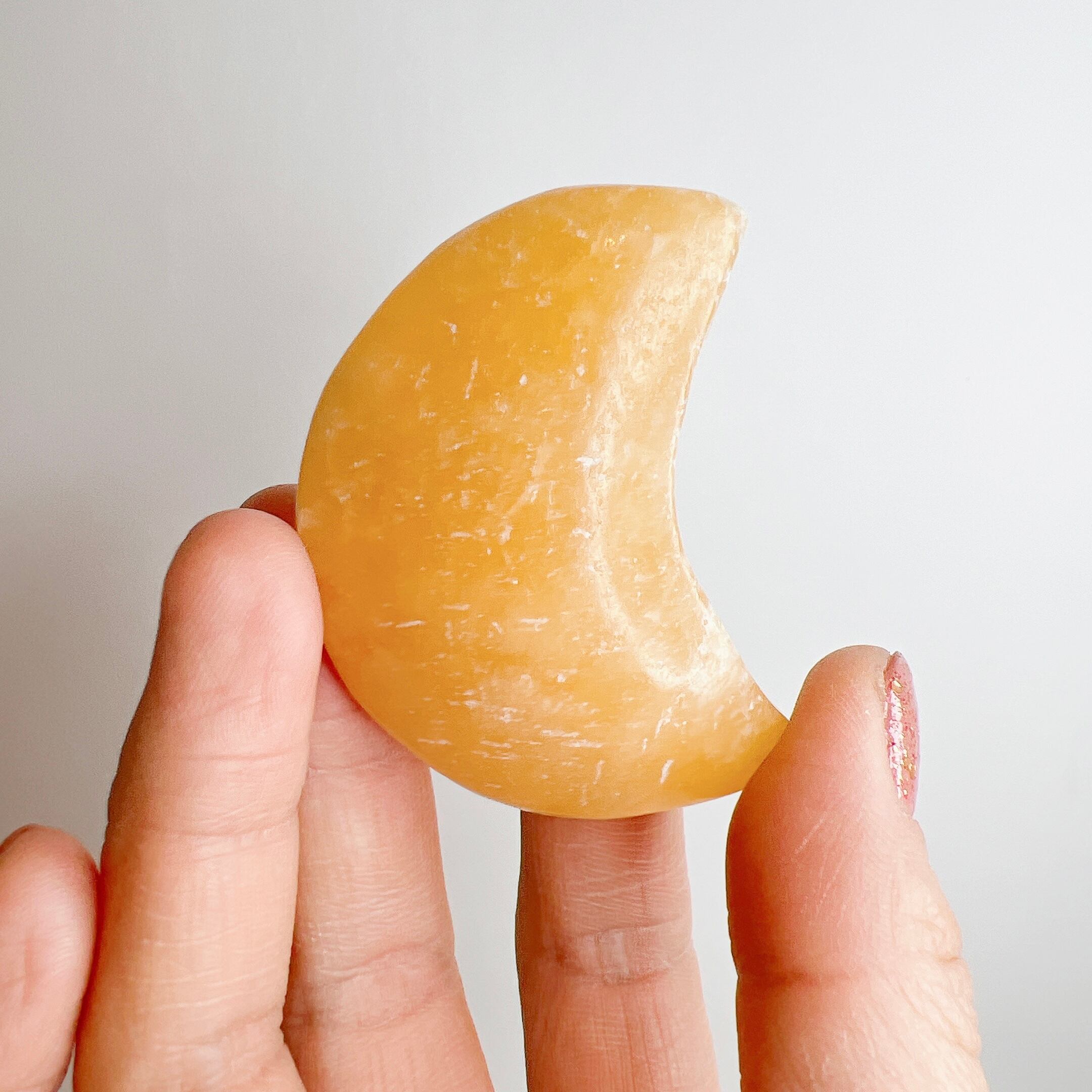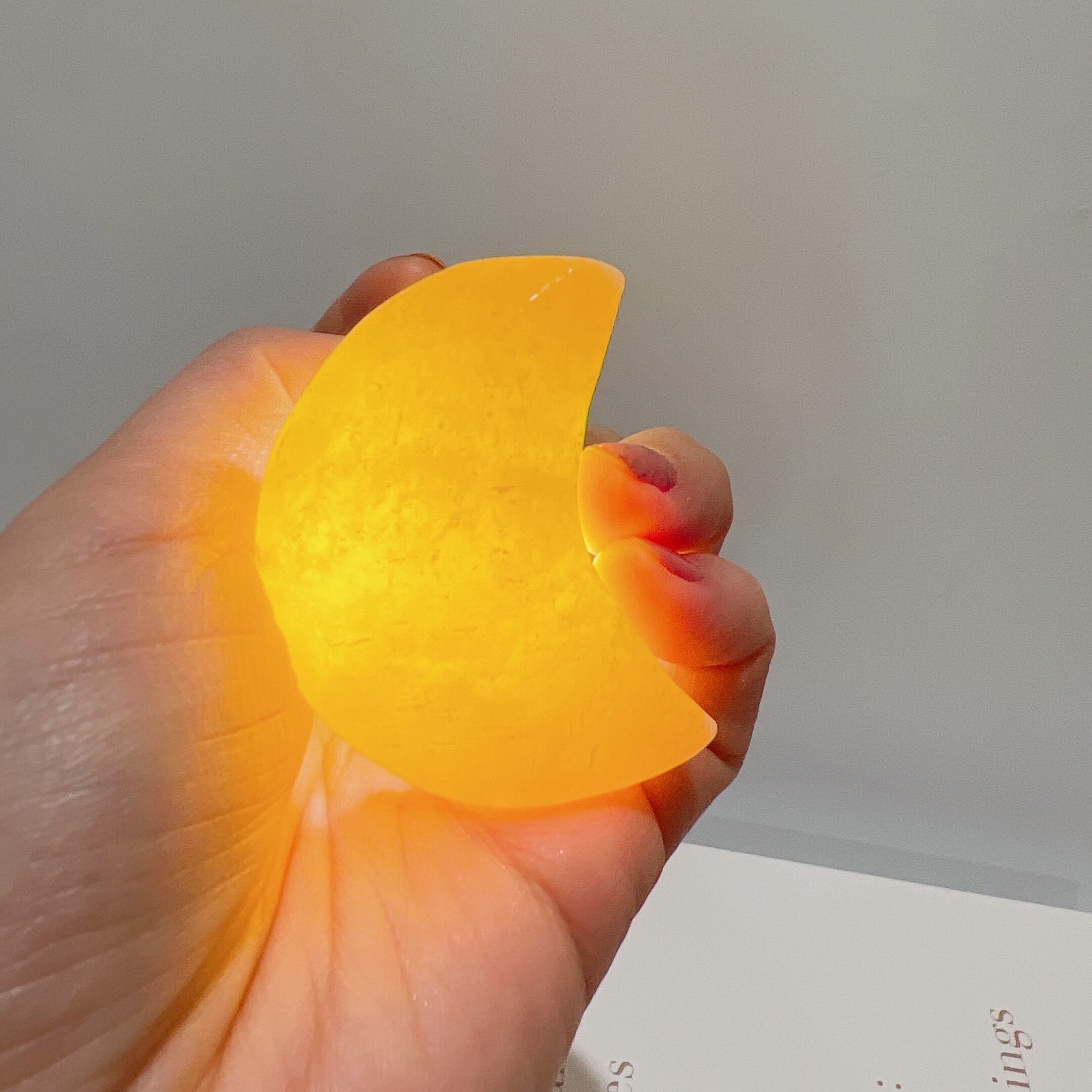 持っているだけで元気になれる存在のオレンジカルサイト♡つるつるではなく原石感も残るマットな質感です♡ライトアップすると、まるで本物のお月さまを手のひらで包んでいるかのよう♡