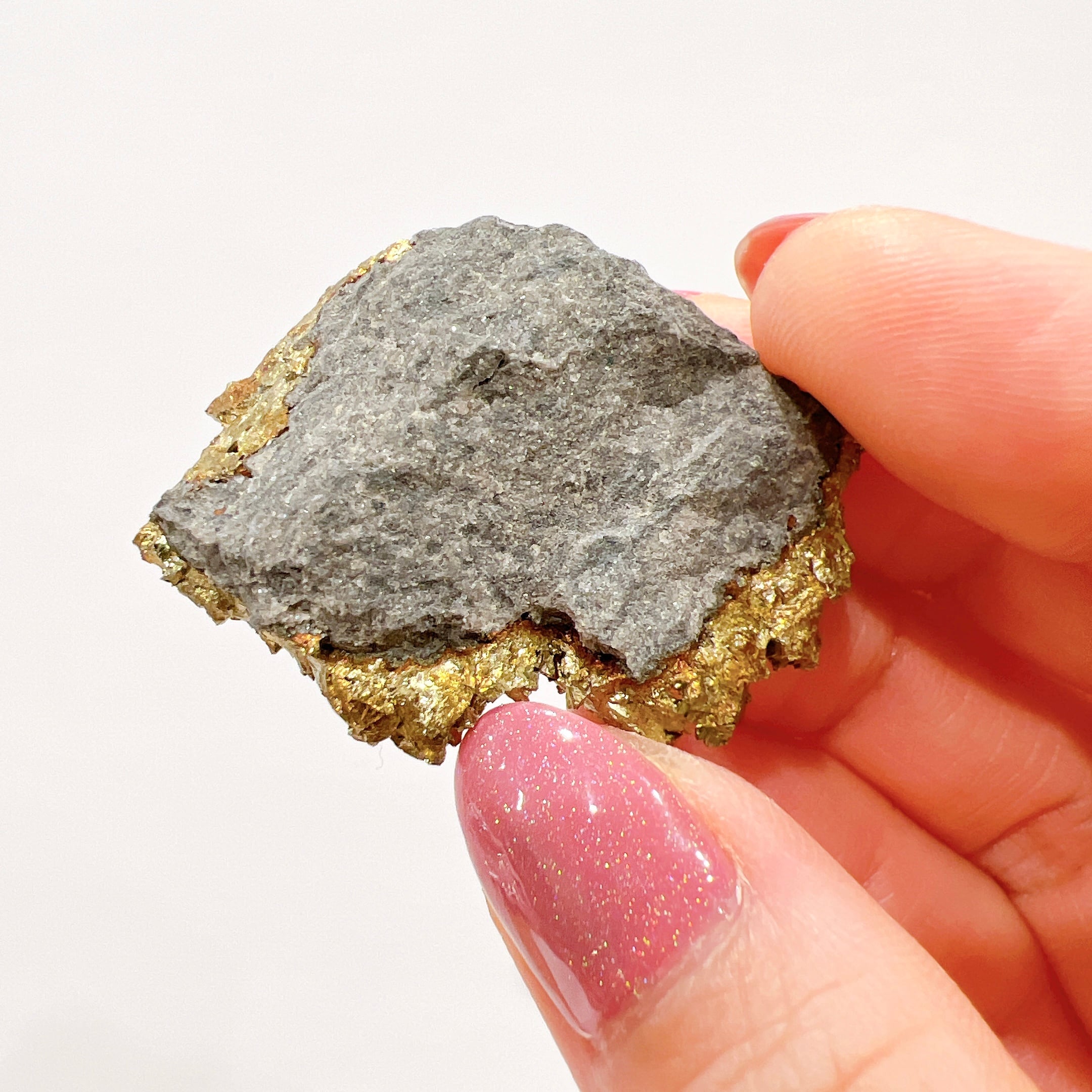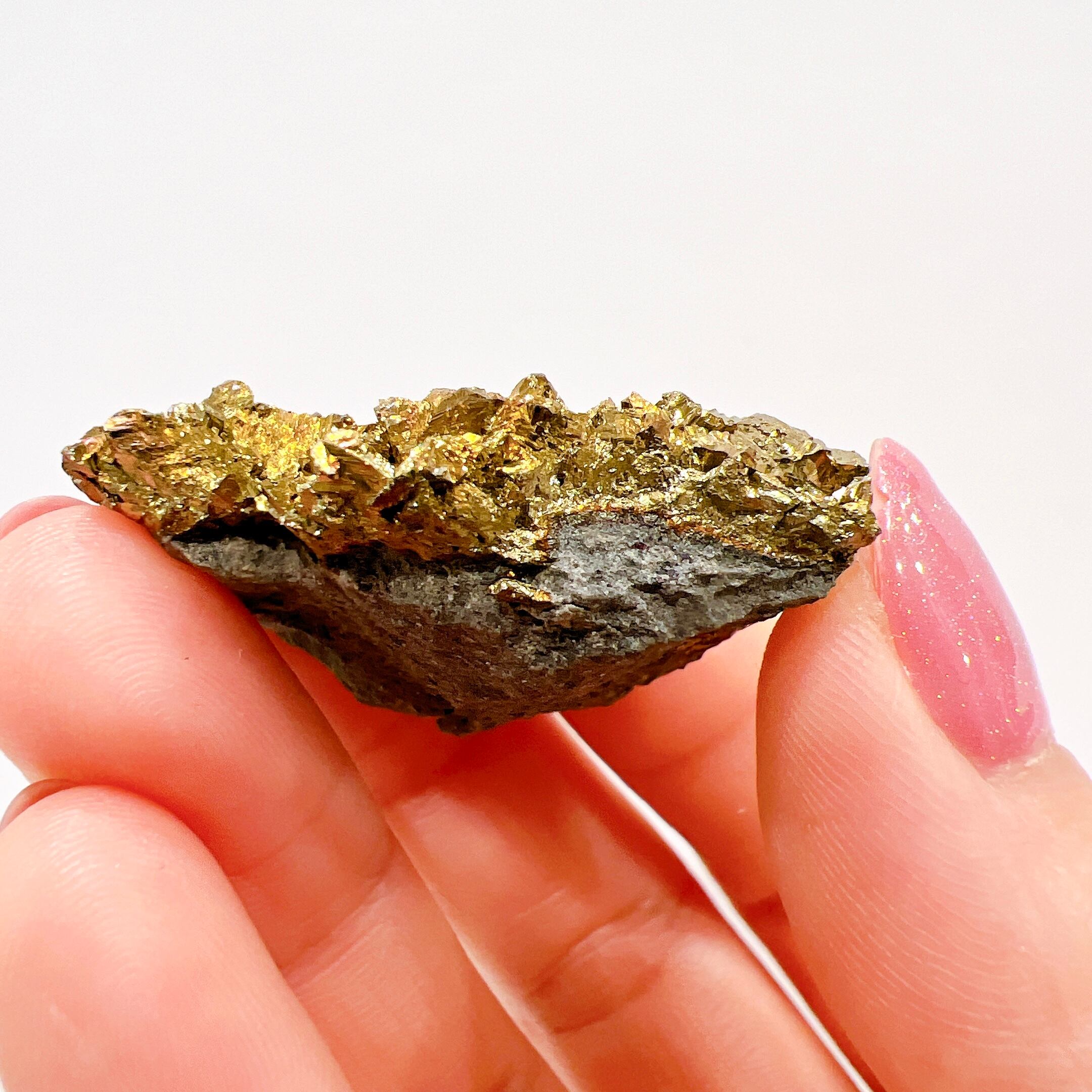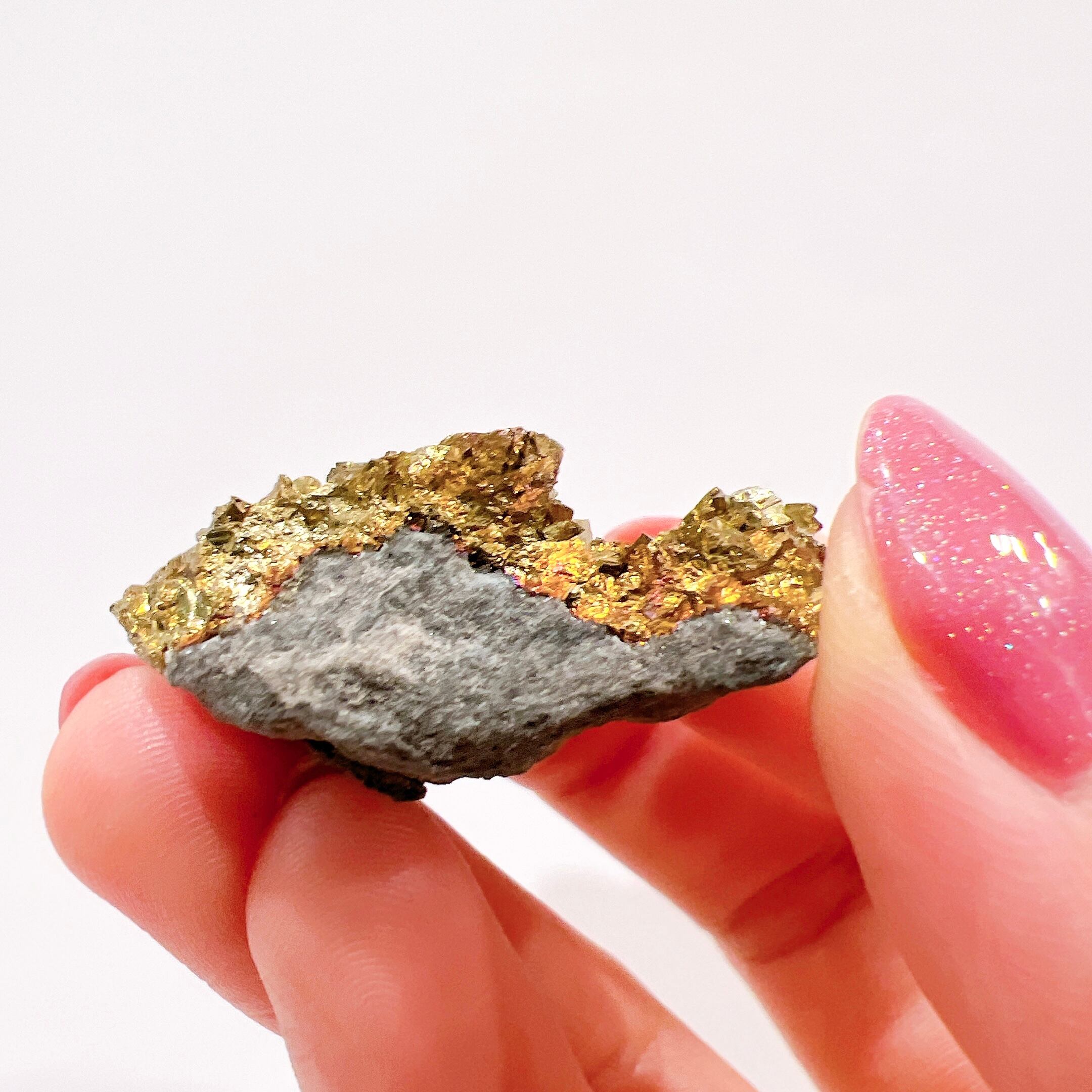 金箔?と思ってしまうくらい金色に輝くチャルコパイライトです♡一部メタルピンクっぽい色も見られます♡チャルコパイライトは酸化すると金色から美しい虹色に変色していくのでさまざまな色の変化を楽しめるかもしれません♡この綺麗な金色は採掘してまだ時が経っていない証拠♡