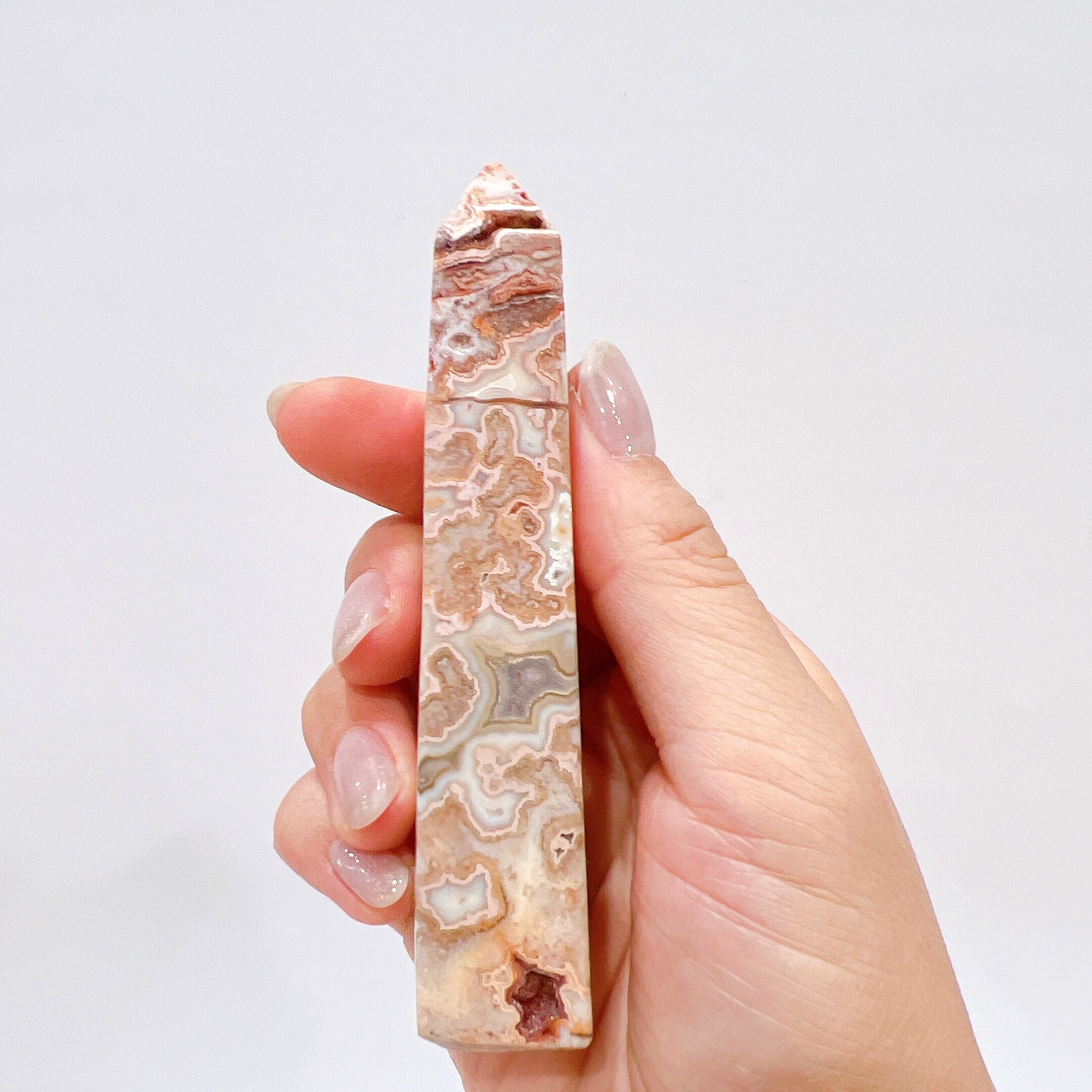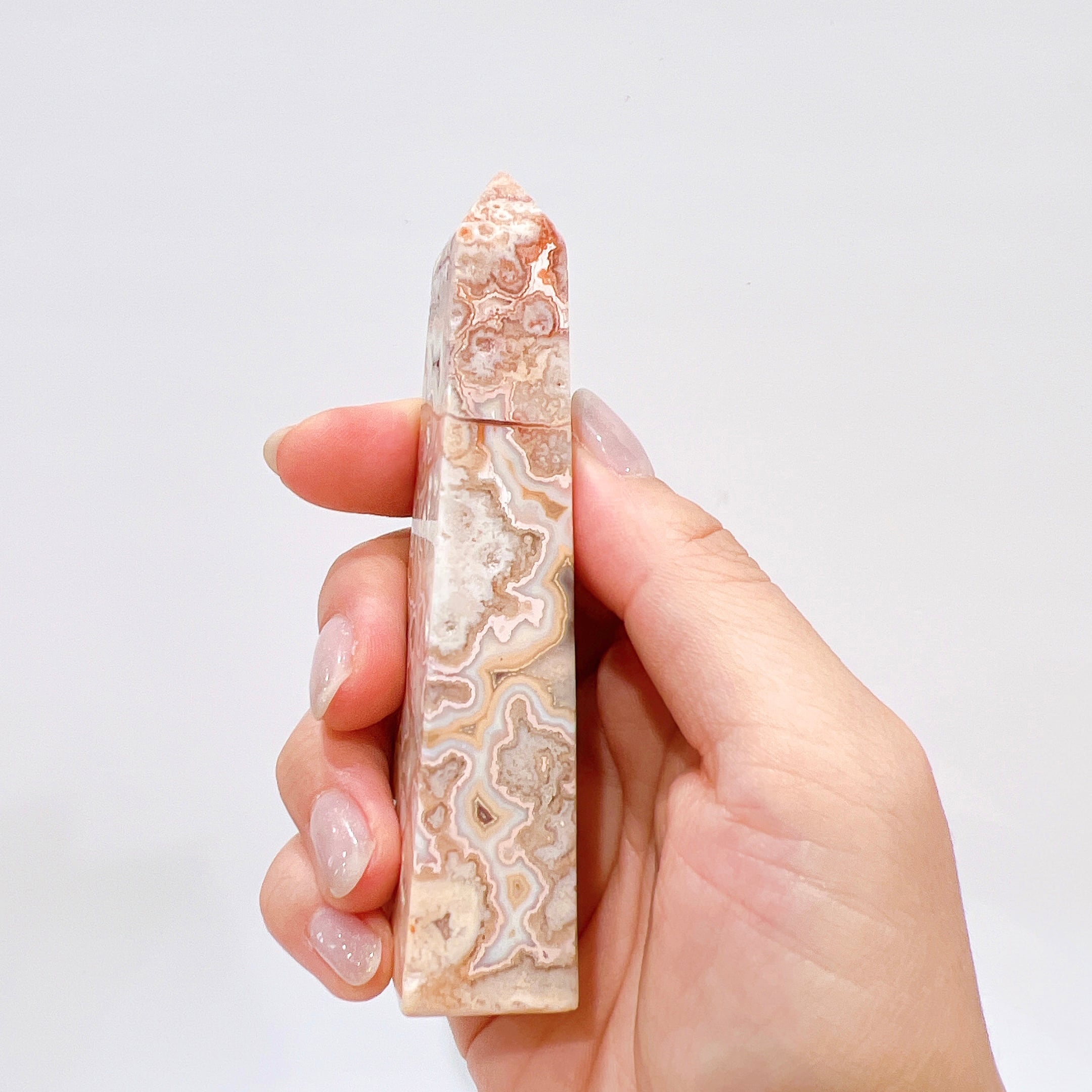 色と模様が魅力的なアゲート♡ピンクとオレンジの色がとても可愛いです♡正面やサイド、先端付近に赤いドゥルージーがあり、先端付近のドゥルージーはポイントの形に合わせて橋のようにアゲート部分が繋がっていてよく割れないで繋がっているなぁと、愛でポイントの一つです♡置いておくだけで絵になるポイントちゃん♡70年代のヒッピーを想わせるようなcuteでレトロな模様です♡
