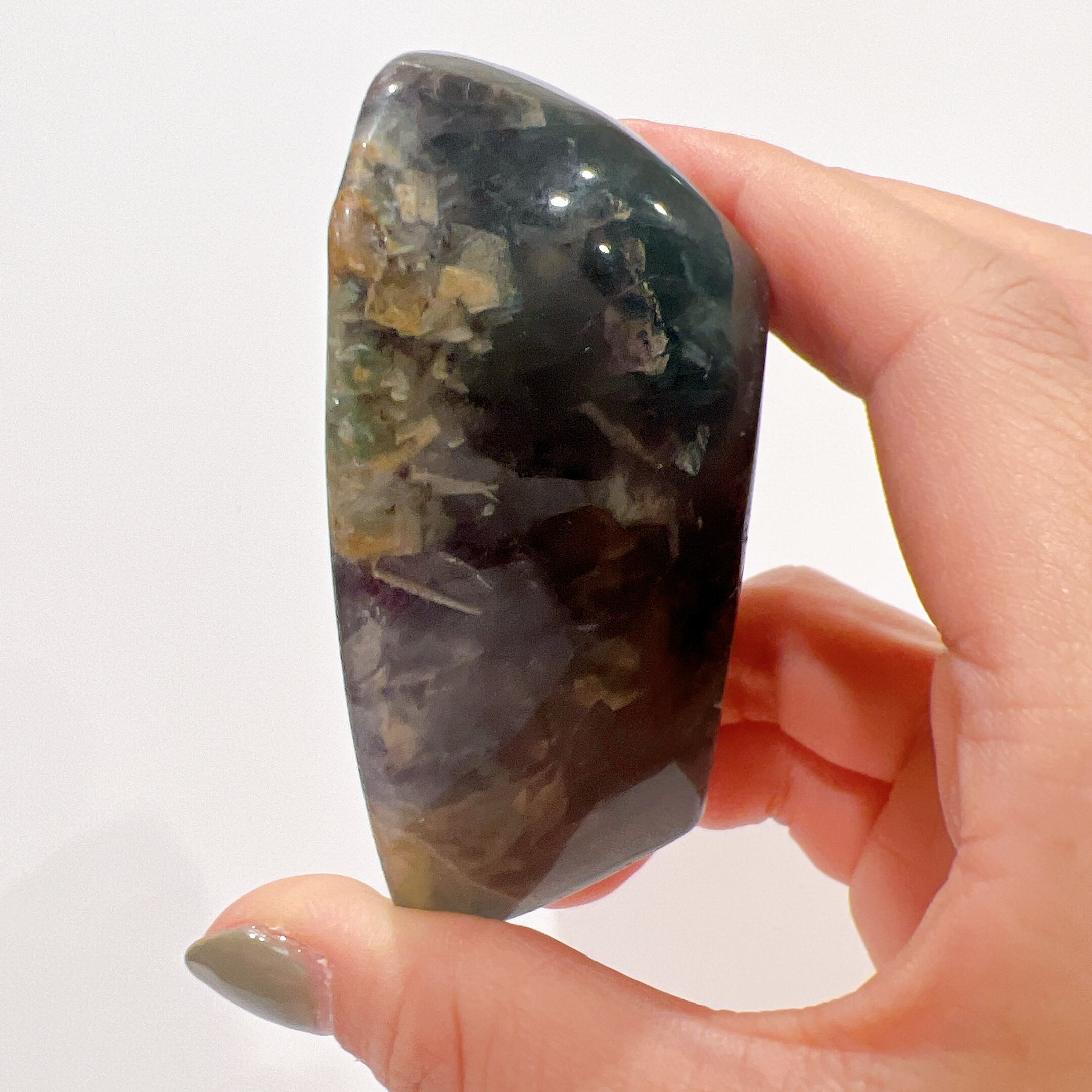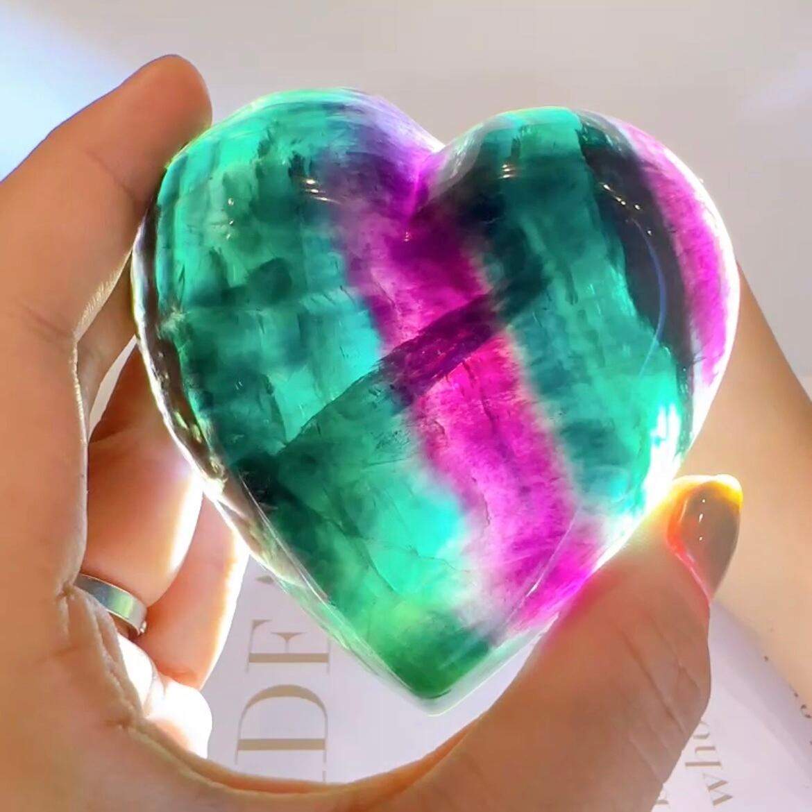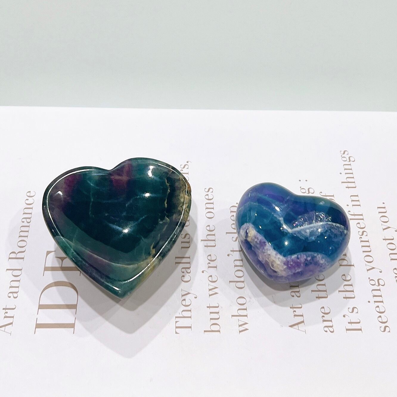 ずっしりとした重量のあるフローライトのハートボウル♡一見落ち着いた色に見えますが、探せば探すほど色の深い部分に見える虹が魅力的です♡ライトアップするとそんな可愛い色してたの?♡と言いたくなってしまう子です♡アクサセリー置きにおすすめです♡石鹸を小さめに切って石鹸置きにするのも良いかも♡