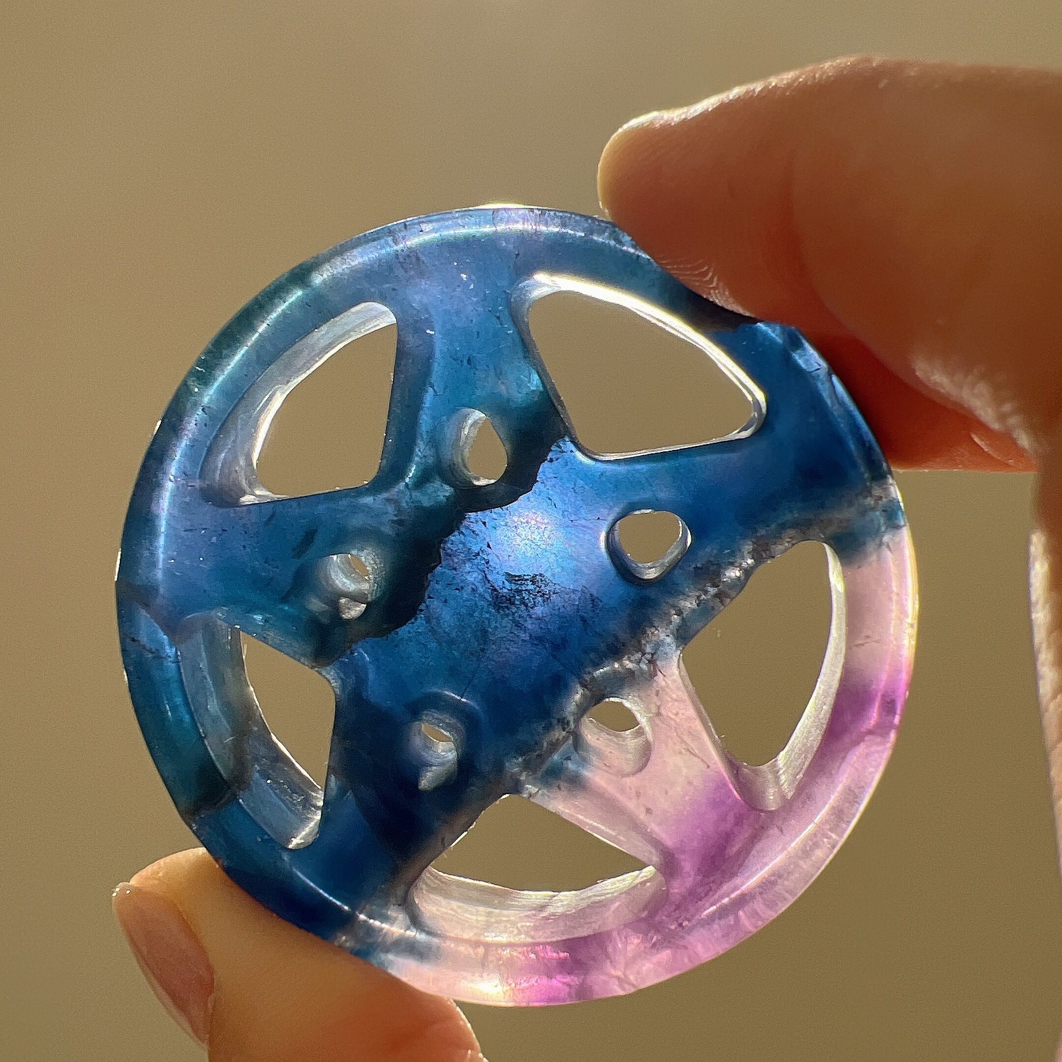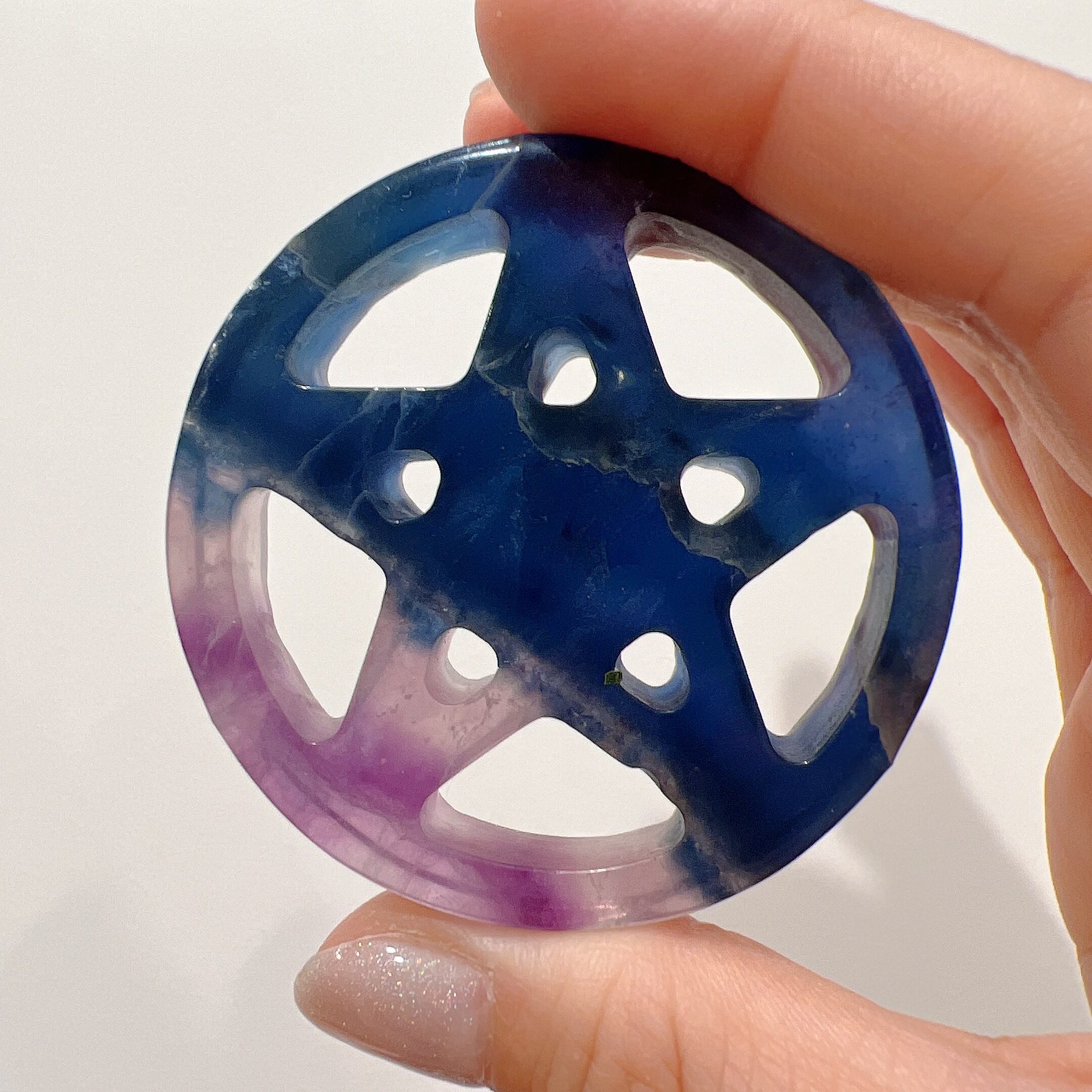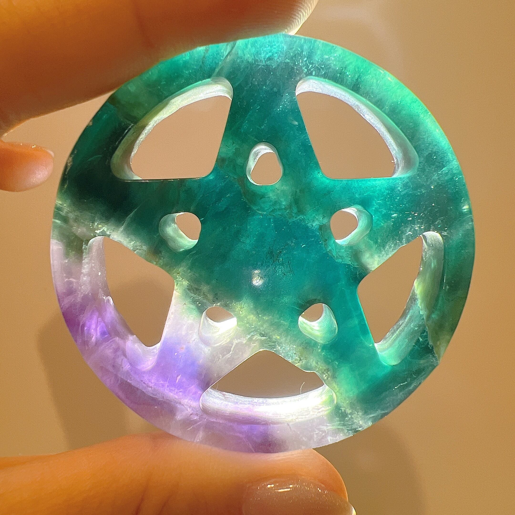 ブルーグリーンとパープルの五芒星フローライトB♡肉眼ではディープブルー&パープル、ライトアップするとグリーン&パープルに♡五芒星の形ってだけで可愛くないですか♡手のひらサイズなので持ち歩きも出来ます♡グリッドに使用したり、スフィア置き、お気に入りの天然石置きにも♡