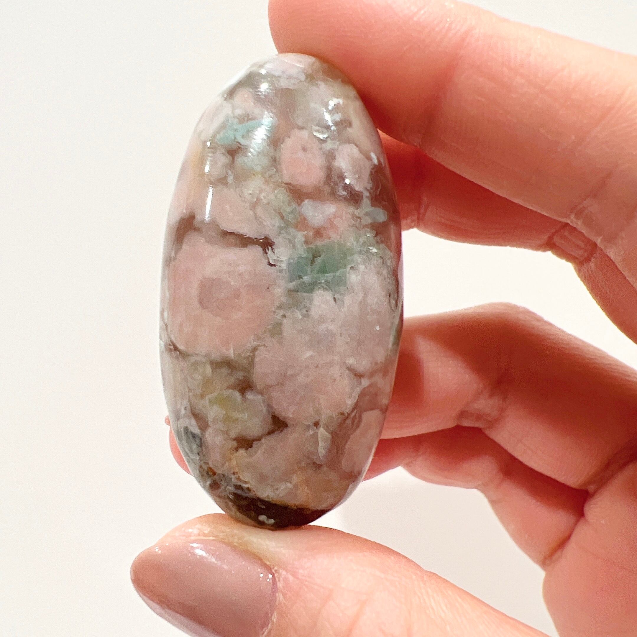ピンク色の可愛いお花がメインでところどころグリーンが入っていて全体的に透明感があります♡40gあり今回のタンブルちゃんの中で1番大きい子♡