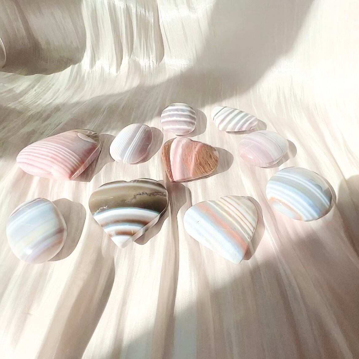 ボツワナアゲートはボツワナ共和国で産出される瑪瑙で他の瑪瑙に比べて縞模様が細かく淡い色合いが特徴です♡この子はブラウンとブラックの中間色のような色でスタイリッシュな子♡水晶化している部分がキラキラしています♡