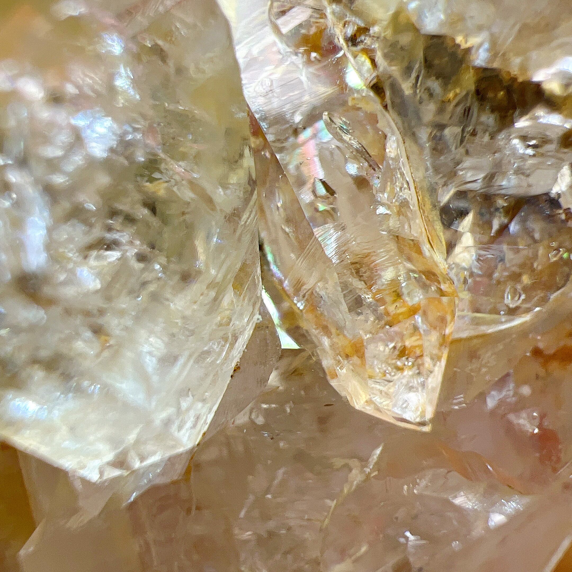 テリつやのあるゴールデンヒーラーが含まれたエレスチャルクォーツ♡綺麗な虹が見える部分も多く水入り箇所が1つのクォーツに集中していて4つの水泡が確認できます♡1つは大きめでゆっくりと、他の3つは小さめで可動します♡また、デンドリック部分もあったりと魅力満載♡